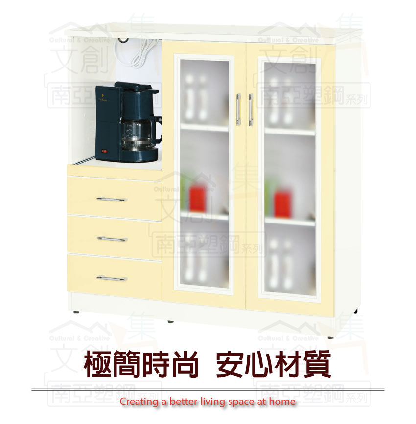 【文創集】莉卡利 環保3.6尺南亞塑鋼二門三抽層架中餐櫃/收納櫃 產品採用第一品牌-台製南亞塑鋼舒美板+五金滑軌結構材質,整體材質採用防水+防燃+無甲醛安心塑鋼材質製造 ,搭配開門櫃+三抽屜+內&外開放式層格+拉合式層架等便利收納空間設計,防止受潮,增加支撐力,堅固不會塌陷,全由專人配送到家,專業安心服務,替你省下更多時間!