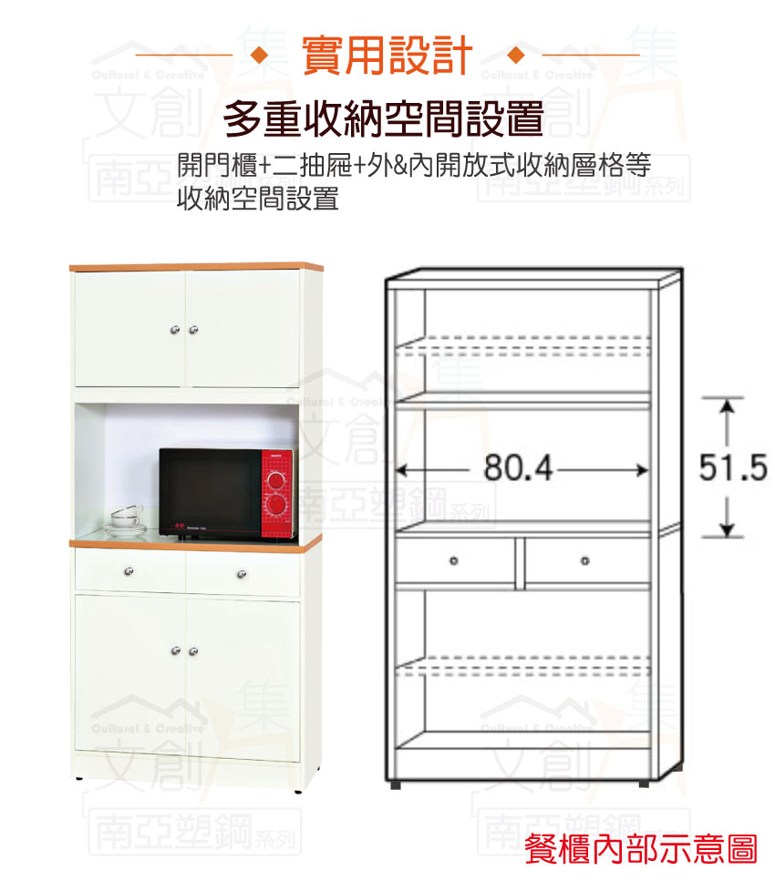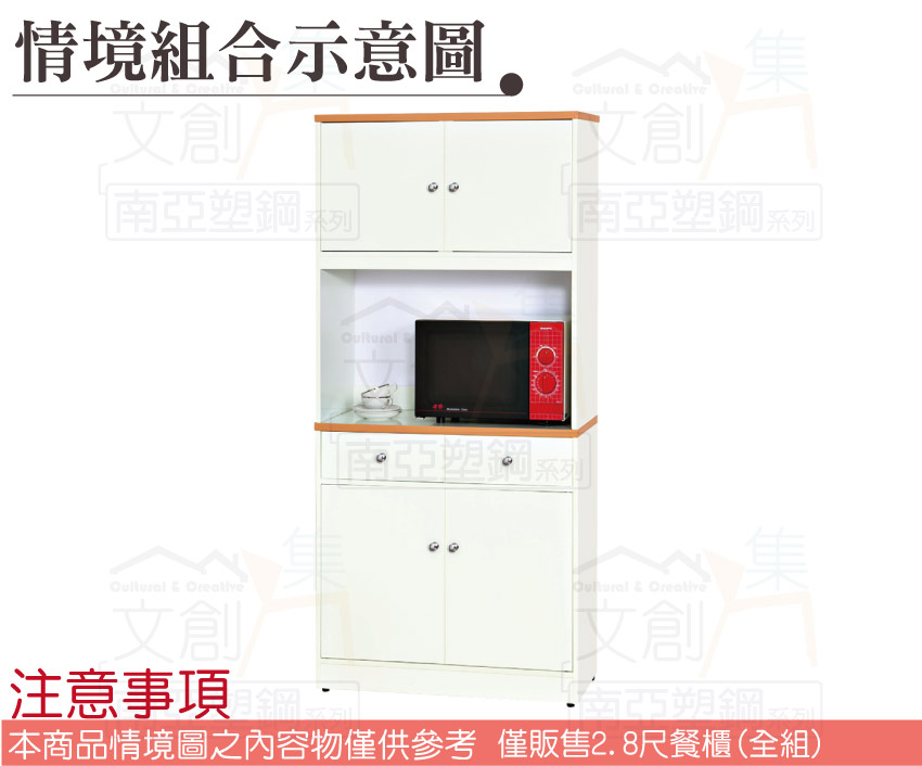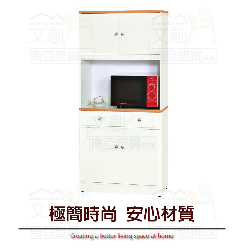 【文創集】波莉 環保2.8尺南亞塑鋼四門二抽高餐櫃/收納櫃組合 產品採用第一品牌-台製南亞塑鋼舒美板+五金滑軌結構材質,整體材質採用防水+防燃+無甲醛安心塑鋼材質製造 ,搭配開門櫃+二抽屜+內開放式層格+拉合式層架等便利收納空間設計,防止受潮,增加支撐力,堅固不會塌陷,全由專人配送到家,專業安心服務,替你省下更多時間!