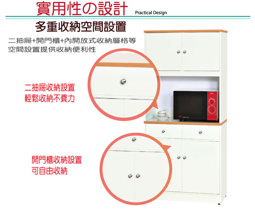 開門櫃+二抽屜+內開放式層格+拉合式層架等便利收納空間設計
