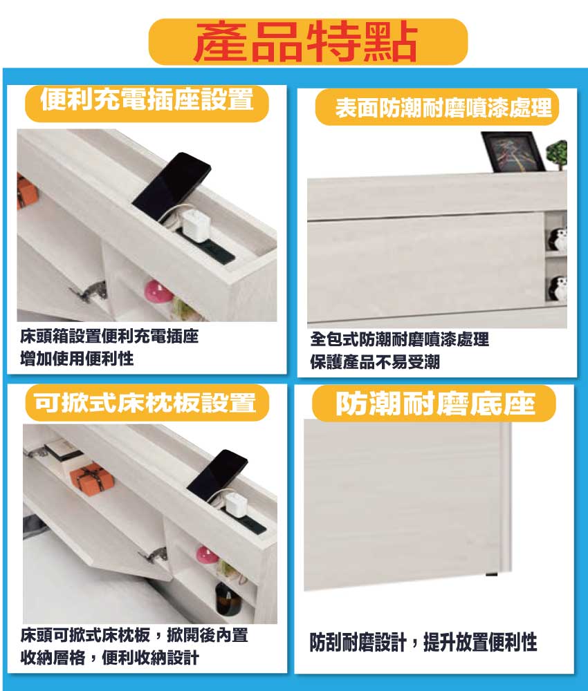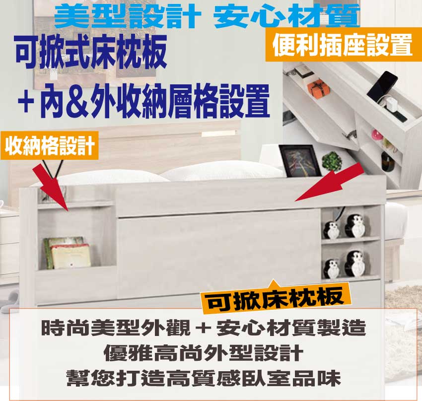 搭配可掀床枕板+內&外開放層格+便利插座設置等收納空間設計