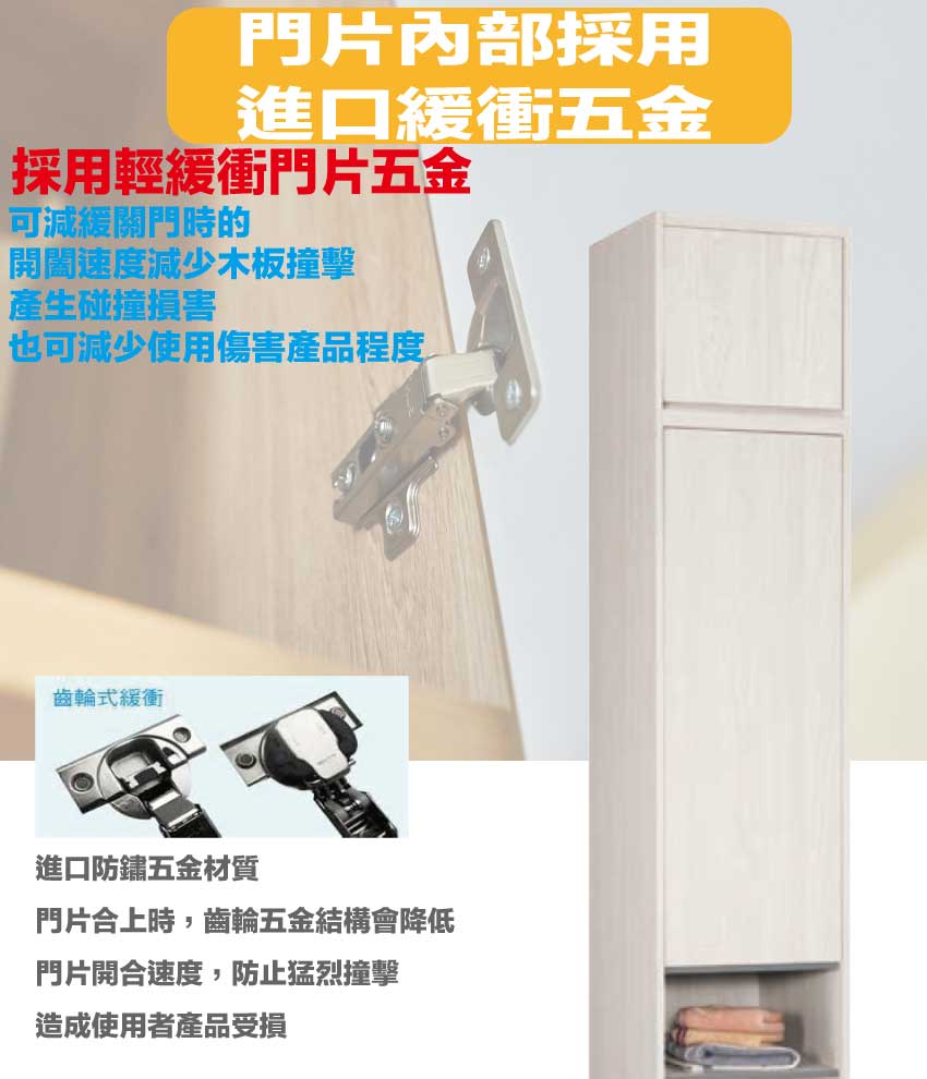 材質:防蛀木心板+防潮耐磨腳座+防夾手緩衝門片五金+五金滑軌結構