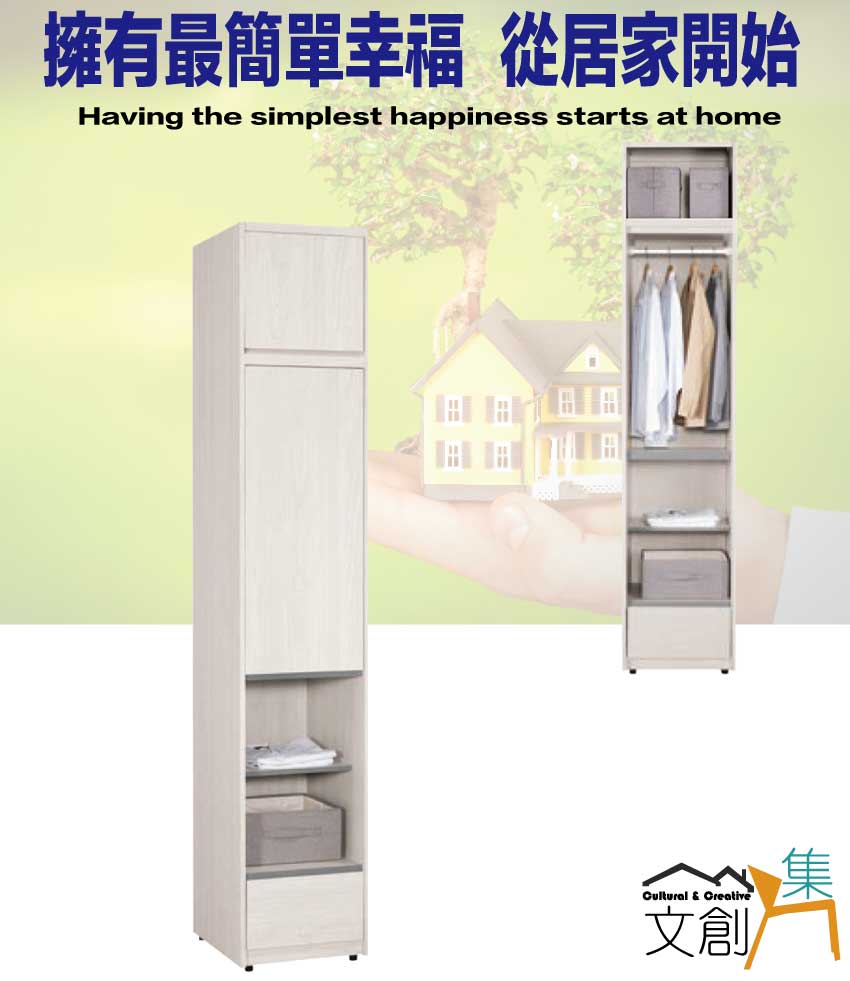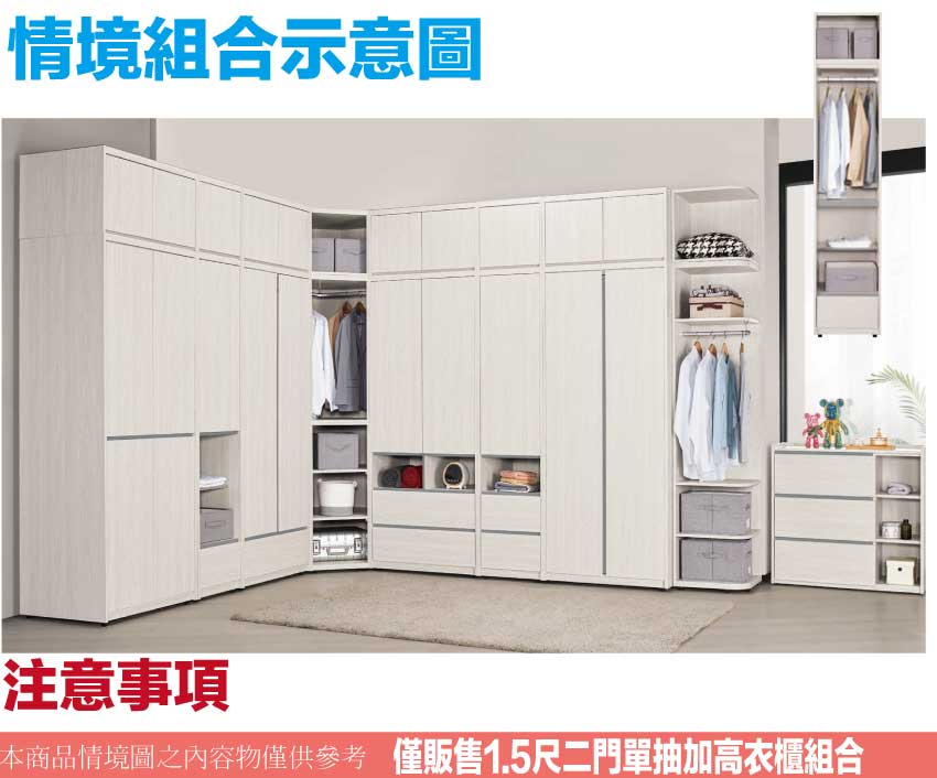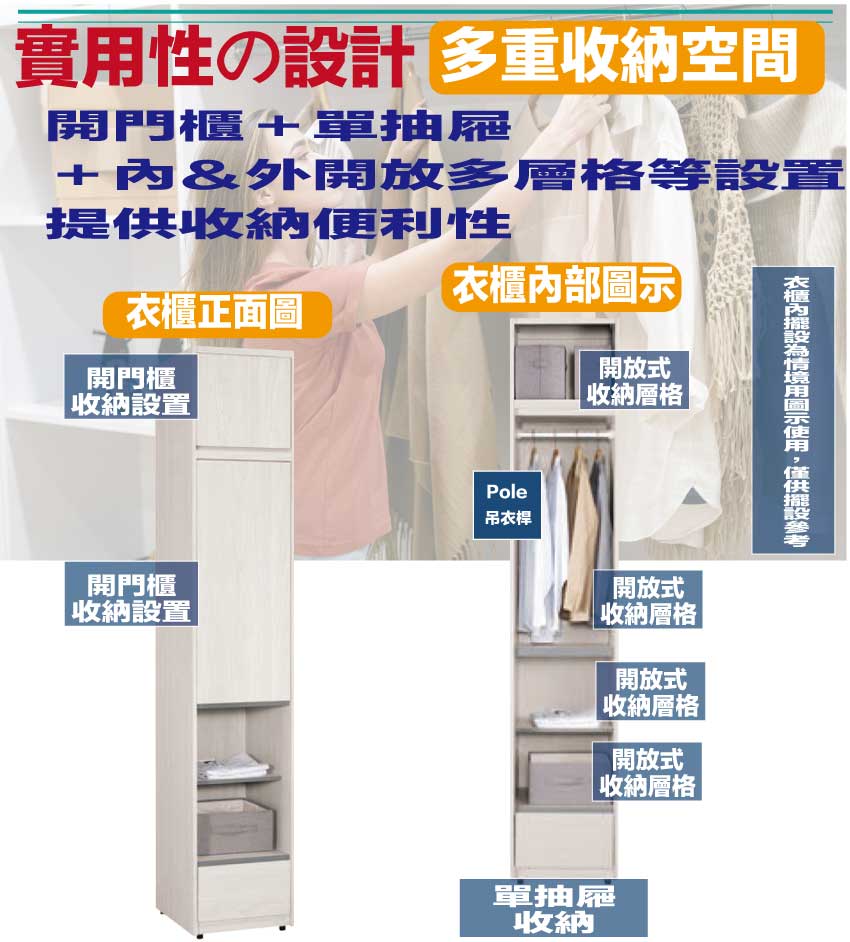 搭配採用開門櫃+吊衣桿+單抽屜+內&外開放層格等收納空間設計