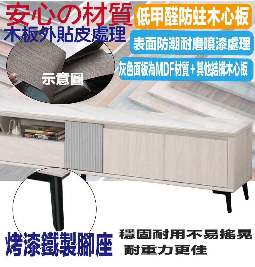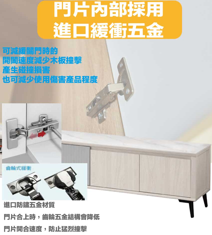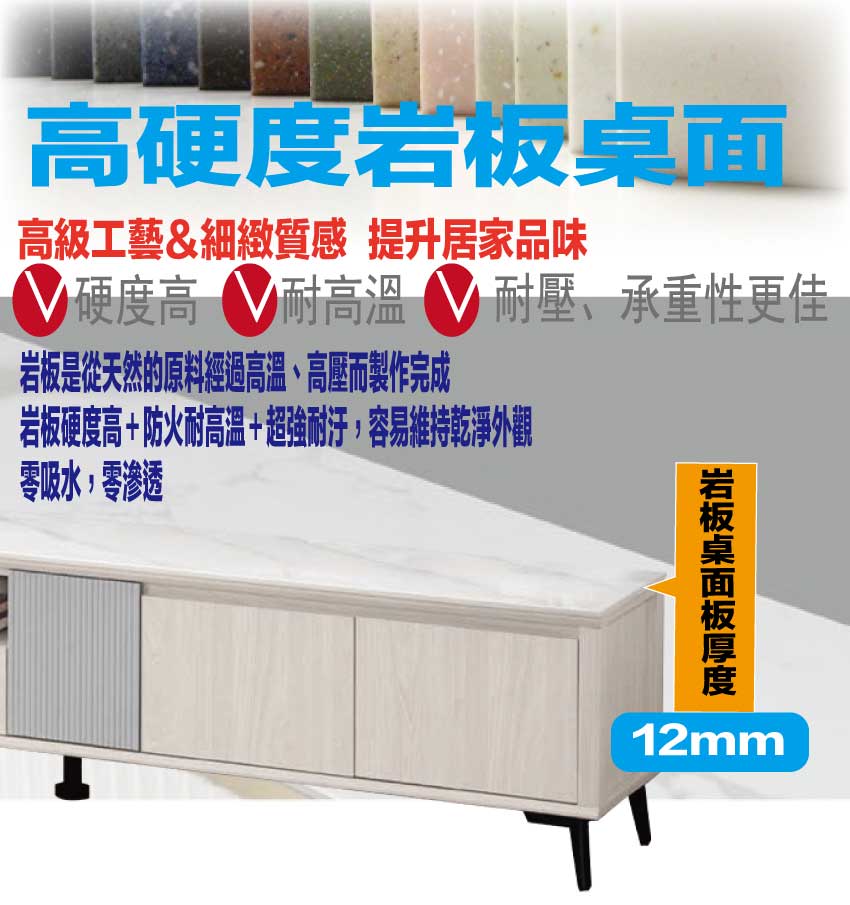 材質:防蛀木心板+防潮MDF板材(灰色耐磨面板)+五金滑軌結構+烤漆金屬腳座+防夾手緩衝門片五金+12mm高硬度岩板桌面板