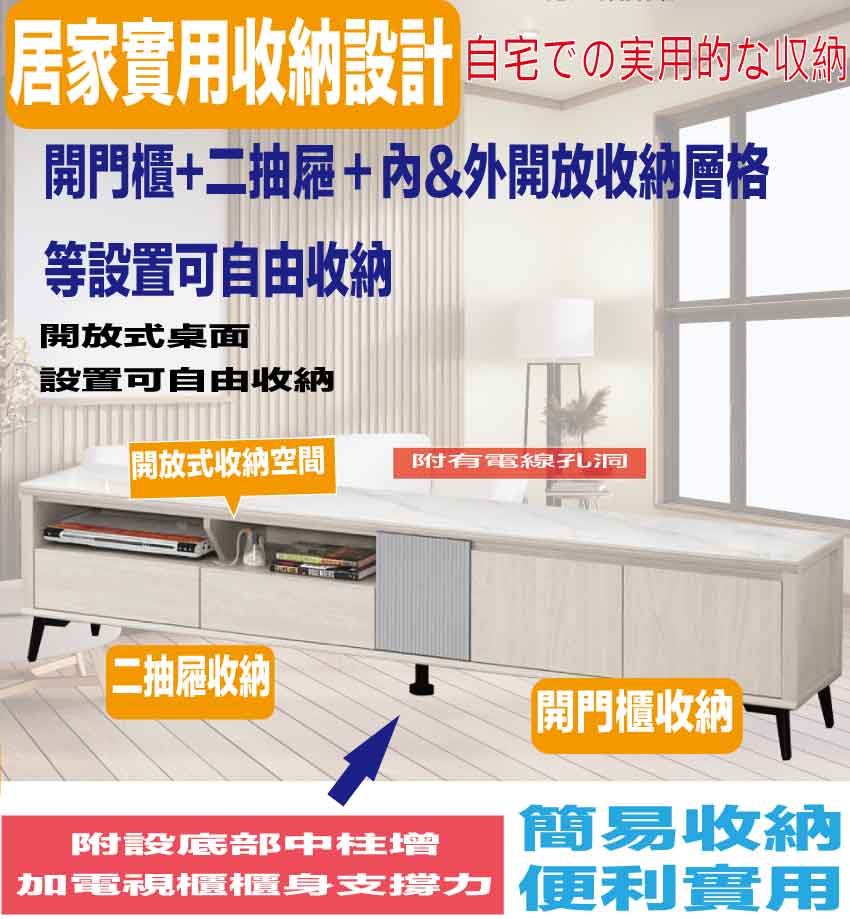 搭配採用開門櫃+二抽屜+內&外開放層格等收納空間設計