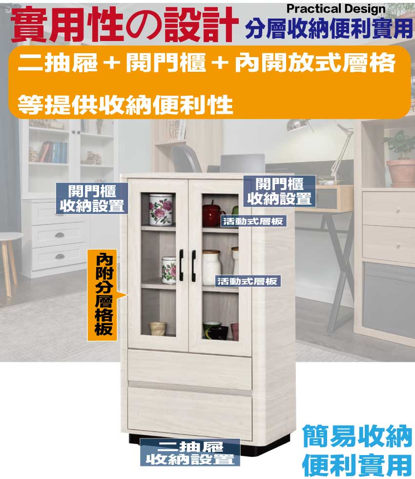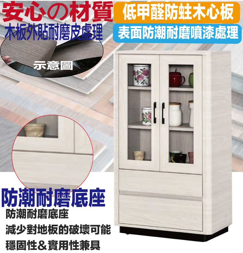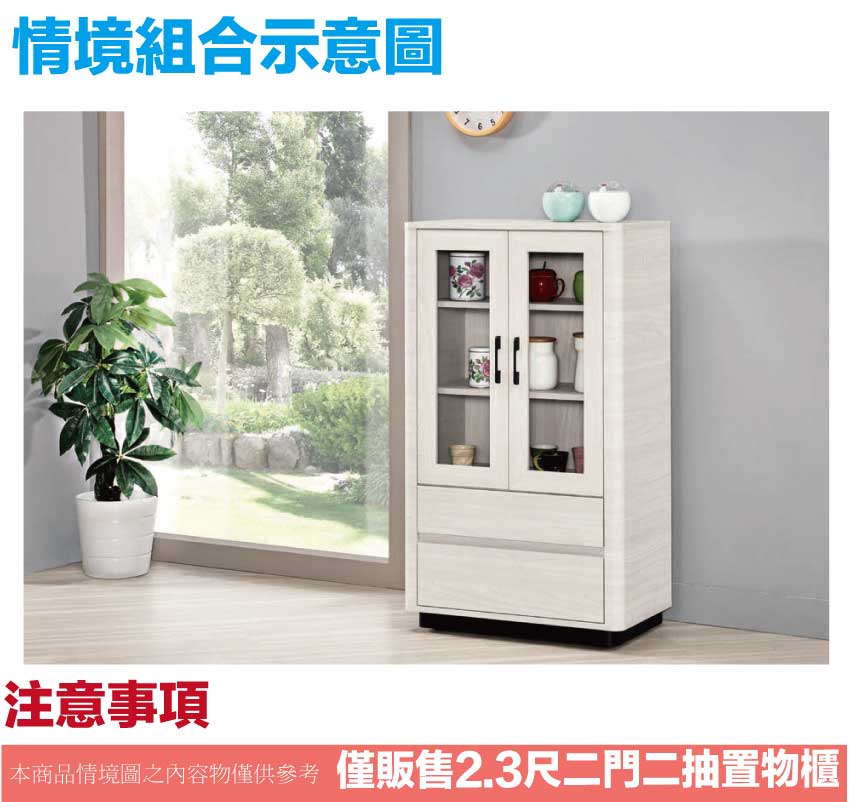 【文創集】丹尼2.3尺二門二抽展示櫃 木紋雙色系+安心材質製造,使用放心+搭配居家更便利,採用防蛀木心板+防潮耐磨底座+防夾手緩衝門片五金+5mm強化玻璃+五金滑軌結構等安心材質製造 ,外層採用防潮耐磨噴漆處理搭配採用開門櫃+二抽屜+內開放層格等收納空間設計,全由專人配送到家,專業安心服務,替你省下更多時間!