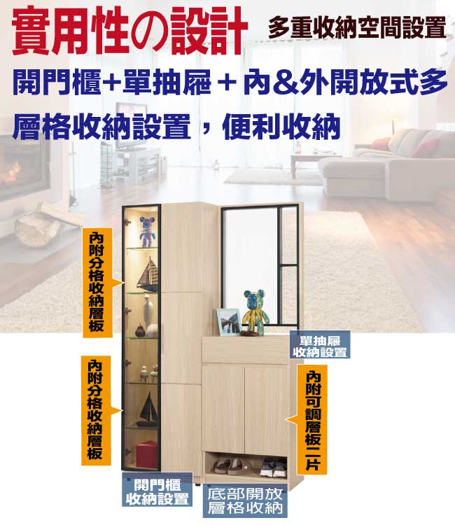搭配採用開門櫃+單抽屜+內&外開放層格+內含LED設置等收納空間設計