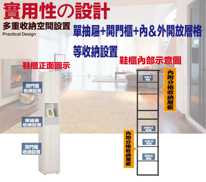 搭配採用開門櫃+單抽屜+內&外開放層格等收納空間設計