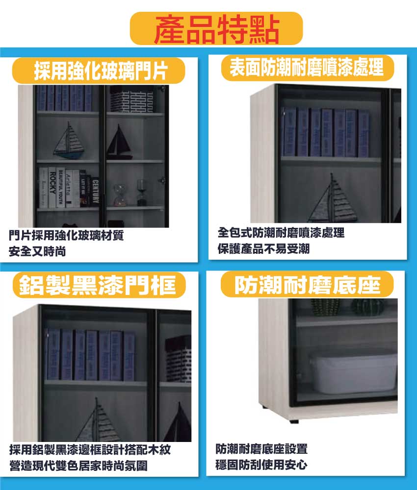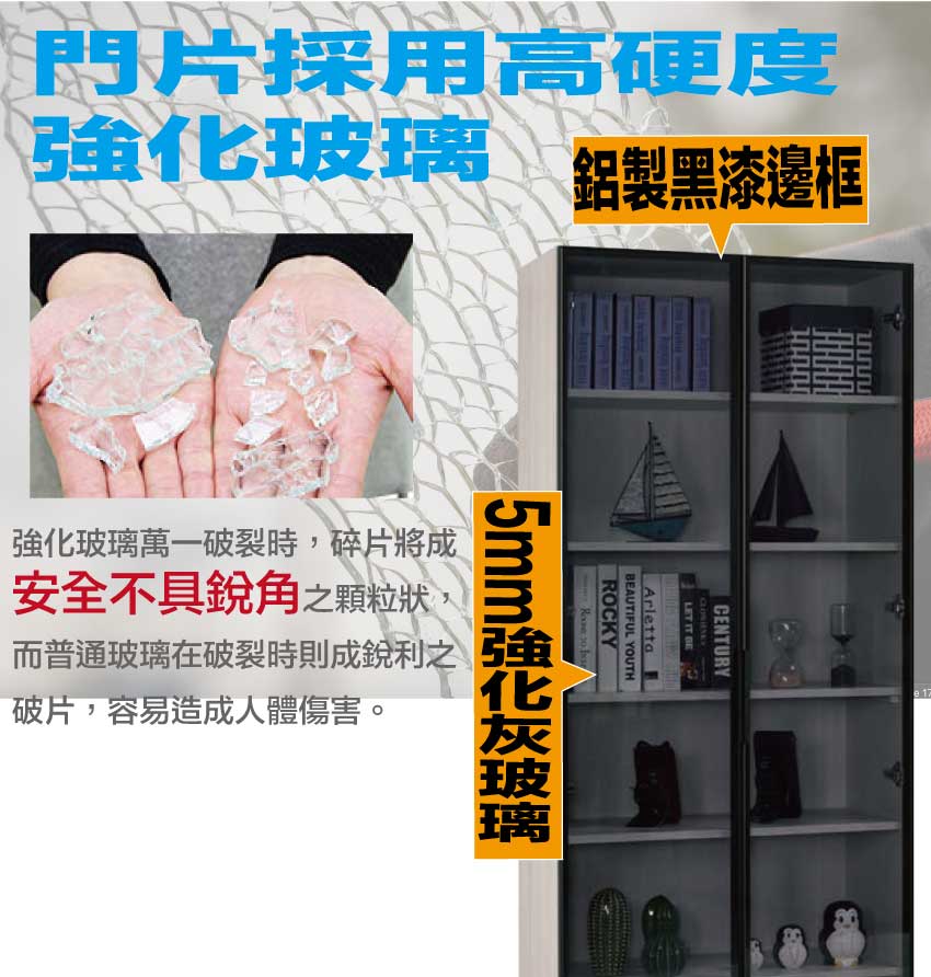 材質:防蛀木心板+防潮耐磨腳座+防夾手緩衝門片五金+鋁製黑漆邊框+5mm強化灰玻璃