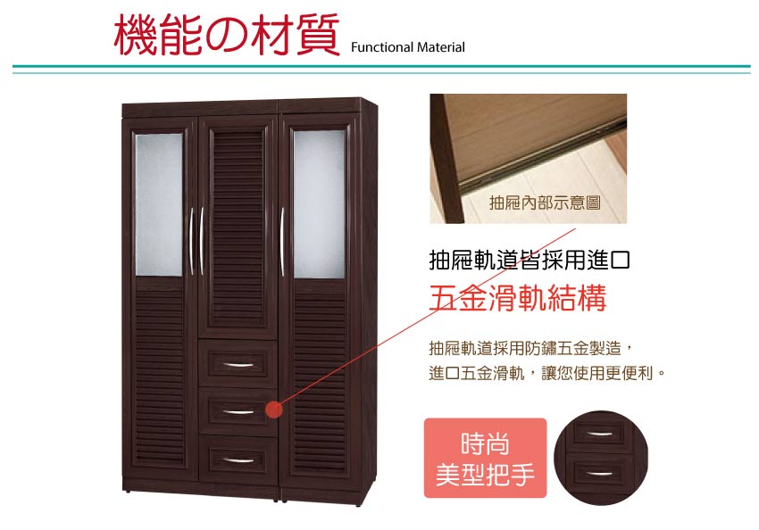 搭配開門櫃+吊衣桿+三抽屜+內開放式收納等便利設計