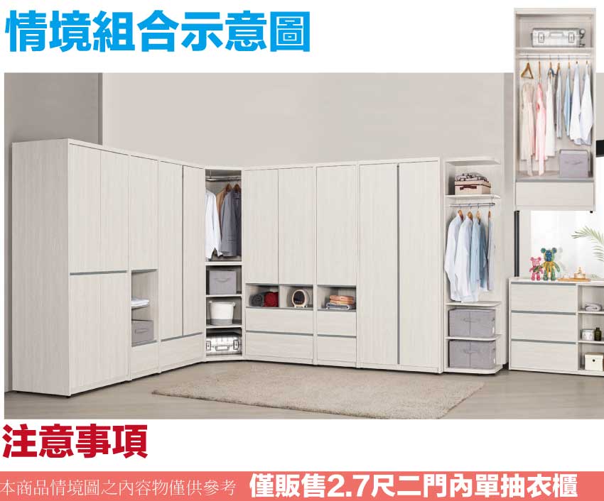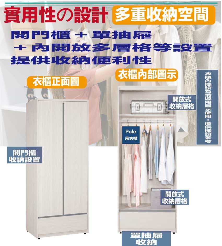 搭配採用開門櫃+吊衣桿+單抽屜+內開放層格等收納空間設計