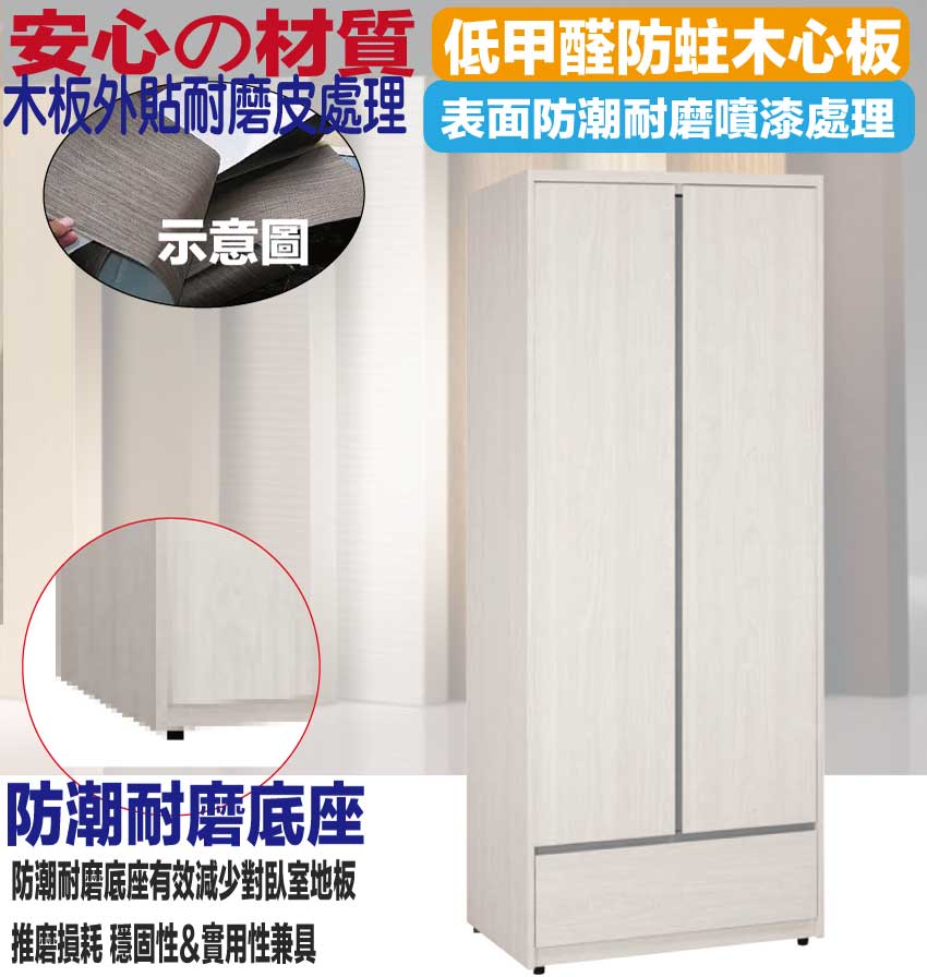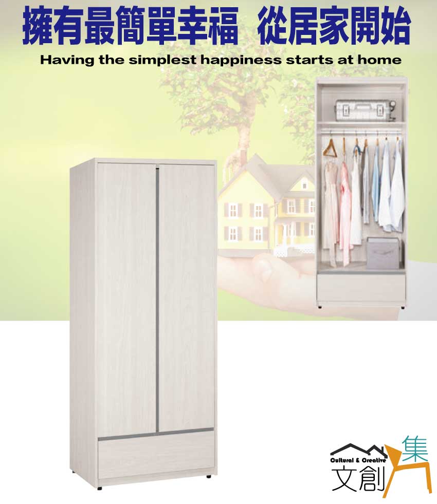 【文創集】華爾2.7尺雙門單抽衣櫃 木紋雙色系+安心材質製造,使用放心+搭配居家更便利,採用防蛀木心板+防潮耐磨底座+防夾手緩衝門片五金+五金滑軌結構等安心材質製造 ,外層採用防潮耐磨噴漆處理搭配採用開門櫃+吊衣桿+單抽屜+內開放層格等收納空間設計,全由專人配送到家,專業安心服務,替你省下更多時間!