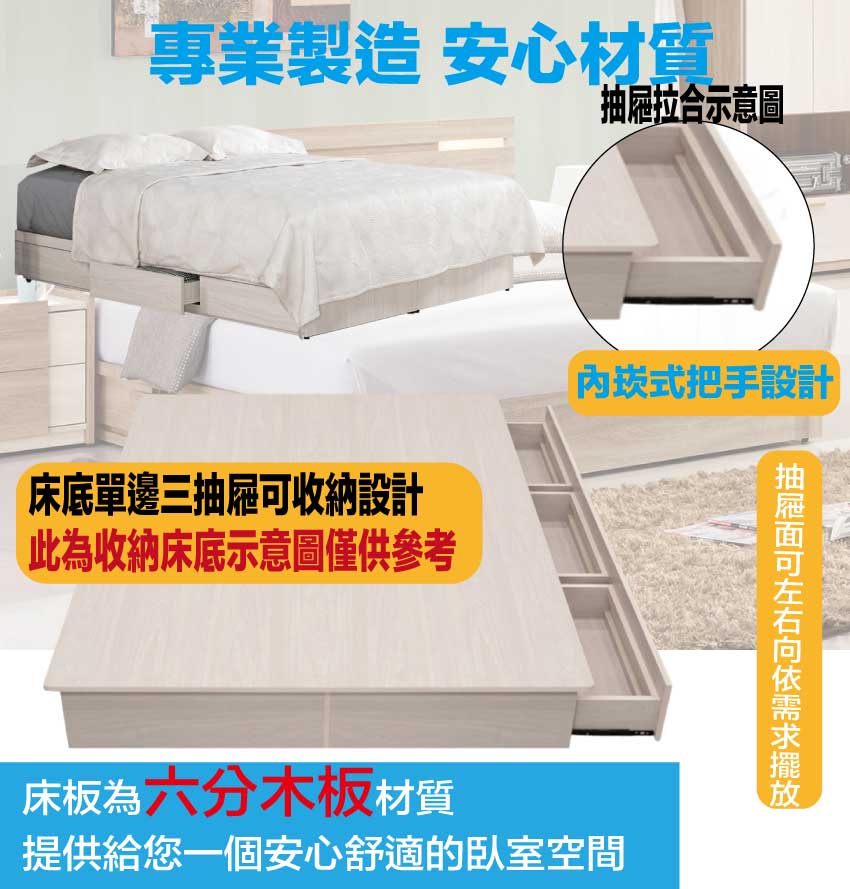 【文創集】華爾6尺雙人加大單邊三抽床底座(不含床墊) 淺橡木紋色系+安心材質製造,使用放心+搭配居家更便利,採用防蛀木心板+防潮耐磨底座+六分木床底等安心材質製造 ,外層採用防潮耐磨噴漆處理搭配床底座單邊開合三抽屜收納空間設計,全由專人配送到家,專業安心服務,替你省下更多時間!