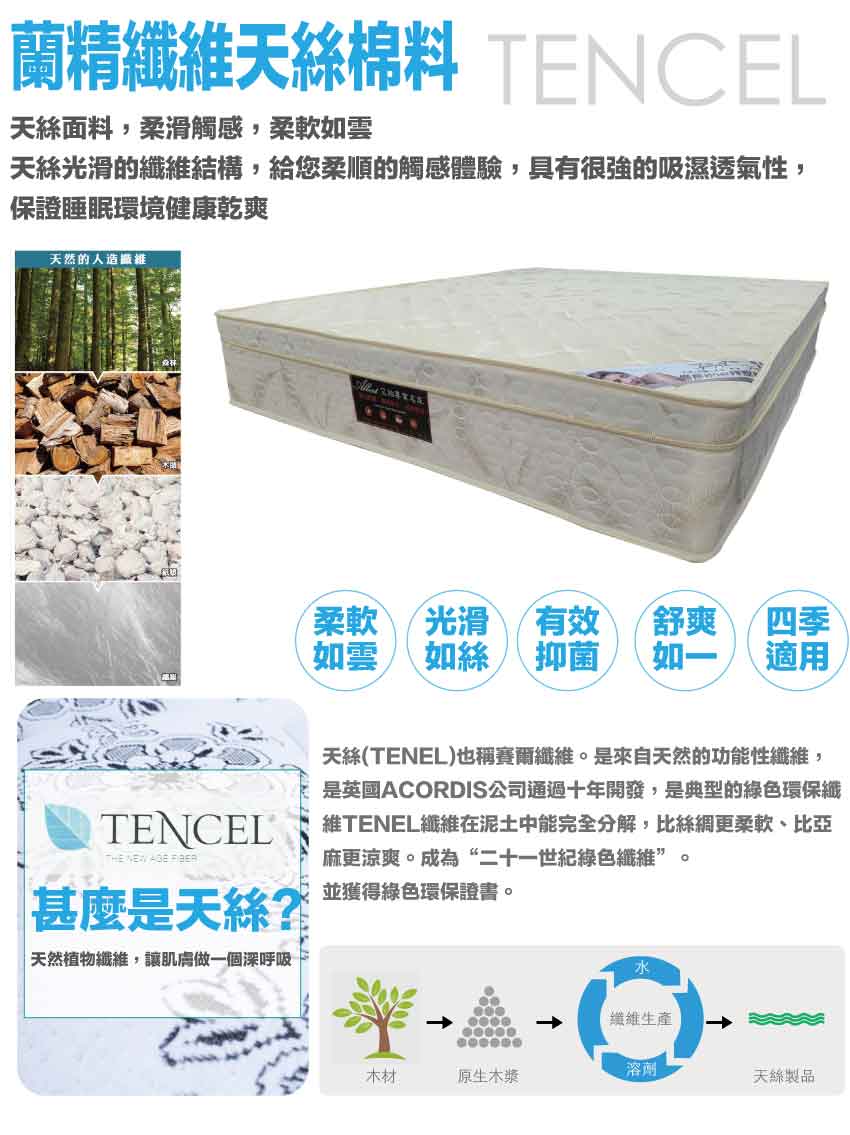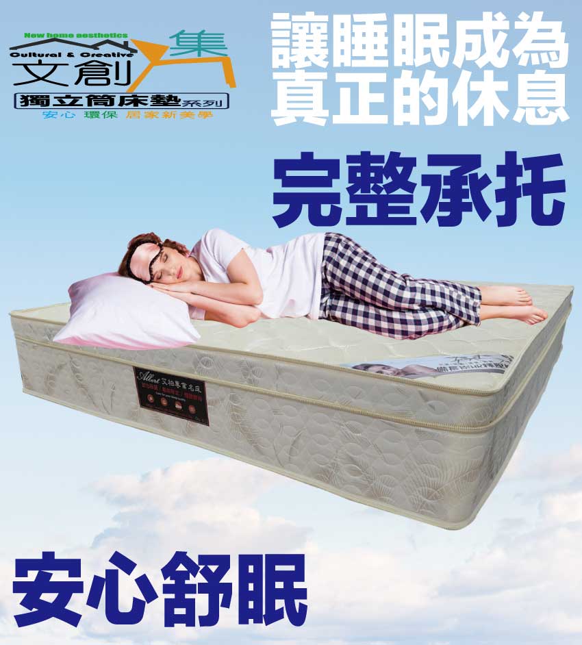 【文創集-床墊系列】3D雙人加大天絲抗菌6尺獨立筒床墊◆商品尺寸:(寬)180x (深)188 x (高)29.5公分◆商品材質:蘭精天絲纖維棉表布+瑞士Sanitized抗菌處理技術+防穿刺透氣棉+止滑透氣底布 +加強型承托海綿+高張力結晶長織棉+加強型四邊M型支撐邊框+3D立體特殊氣流車花+備長碳釋壓棉+高碳鋼746顆2.0mm靜音抗擾中鋼彈簧(袋裝獨立筒彈簧)此款床墊較為厚重搬運時不可彎壓,產品接單時會有專人和您確認電梯或是樓梯寬度,避免造成無法配送搬運造成您時間及成本損耗,請見諒◆商品保固:中鋼彈簧體保固5年(正常使用),保用10年本產品款式共有單人加大(105cm)&雙人(150cm)&雙人加大(180cm)等三種尺寸可供您選擇,請先確定床台的尺寸再購買