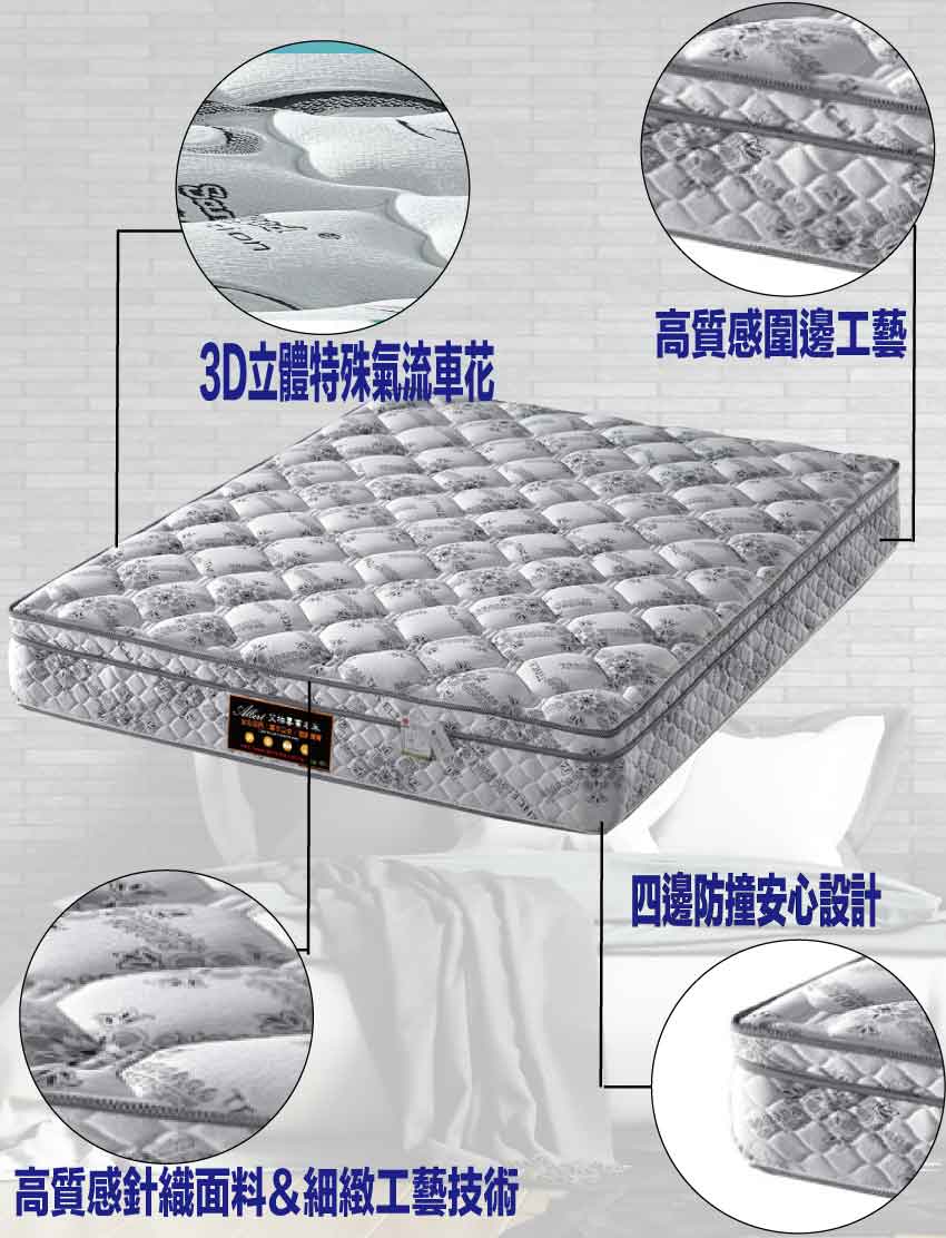 【文創集-床墊系列】抗菌天絲3.5尺單人聯結式彈簧床墊◆商品尺寸:(寬)105x (深)188 x (高)26/公分◆商品材質:3D立體氣流車花+透氣緹花表布+瑞士Sanitized抗菌處理技術+防穿刺透氣棉+止滑透氣底布 +加強型承托海綿+高張力結晶長織棉+備長碳釋壓棉+連結硬式高碳鋼2.3mm線徑靜音抗擾中鋼彈簧◆商品保固:中鋼彈簧體保固5年(正常使用),保用10年本產品款式共有單人加大(105cm)&雙人(150cm)&雙人加大(180cm)等三種尺寸可供您選擇,請先確定床台的尺寸再購買