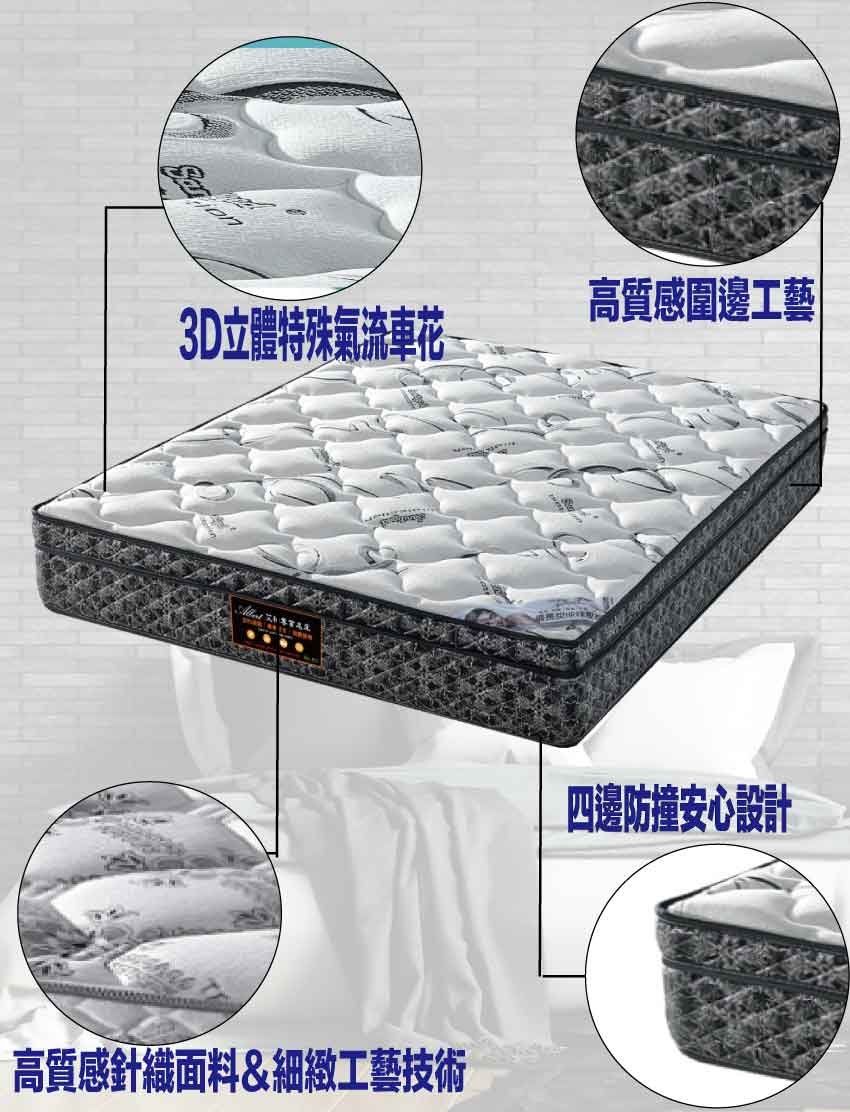 【文創集-床墊系列】3D抗菌舒活5尺雙人獨立筒床墊◆商品尺寸:(寬)150x (深)188 x (高)25公分◆商品材質:瑞士Sanitized抗菌處理技術針織舒柔布+防穿刺透氣棉+止滑透氣底布 +加強型承托海綿+高張力結晶長織棉+加強型四邊M型支撐邊框+3D立體特殊氣流車花+備長碳釋壓棉+高碳鋼696顆2.4mm靜音抗擾中鋼彈簧(袋裝獨立筒彈簧)◆商品保固:中鋼彈簧體保固5年(正常使用),保用10年本產品款式共有單人加大(105cm)&雙人(150cm)&雙人加大(180cm)等三種尺寸可供您選擇,請先確定床台的尺寸再購買
