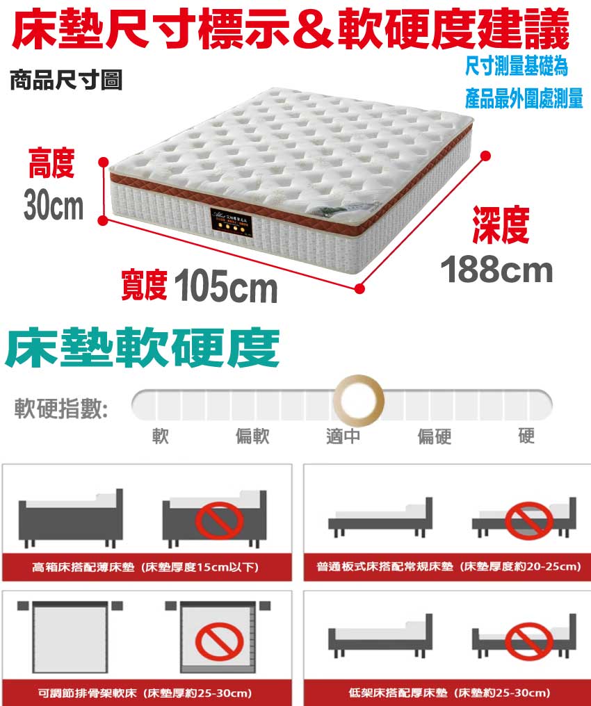 【文創集-床墊系列】3D天絲抗菌乳膠3.5尺單人護框獨立筒床墊◆商品尺寸:(寬)105x (深)188 x (高)30/公分◆商品材質:蘭精天絲纖維棉料表布+植物性天然乳膠+瑞士Sanitized抗菌處理技術+防穿刺透氣棉+PU360度鑽石棉護邊框+高密度釋壓緩衝棉+高張力結晶長織棉+備長碳釋壓棉+立體特殊氣流車花+高碳鋼500顆2.2mm線徑袋裝獨立筒彈簧+3D止滑&防潑水表布此款床墊較為厚重搬運時不可彎壓,產品接單時會有專人和您確認電梯或是樓梯寬度,避免造成無法配送搬運造成您時間及成本損耗,請見諒◆商品保固:中鋼彈簧體保固5年(正常使用),保用10年本產品款式共有單人加大(105cm)&雙人(150cm)&雙人加大(180cm)等三種尺寸可供您選擇,請先確定床台的尺寸再購買