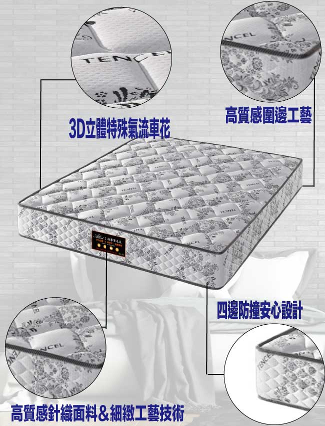 【文創集-床墊系列】抗菌天絲6尺雙人加大護邊獨立筒床墊◆商品尺寸:(寬)180x (深)188 x (高)24.5/公分◆商品材質:蘭精天絲纖維棉料表布+瑞士Sanitized抗菌處理技術+防穿刺透氣棉+加強型四邊M型支撐邊框+高密度釋壓緩衝棉+高張力結晶長織棉+備長碳釋壓棉+立體特殊氣流車花+高碳鋼835顆2.4mm線徑袋裝獨立筒彈簧+3D止滑&防潑水表布此款床墊較為厚重搬運時不可彎壓,產品接單時會有專人和您確認電梯或是樓梯寬度,避免造成無法配送搬運造成您時間及成本損耗,請見諒◆商品保固:中鋼彈簧體保固5年(正常使用),保用10年本產品款式共有單人加大(105cm)&雙人(150cm)&雙人加大(180cm)等三種尺寸可供您選擇,請先確定床台的尺寸再購買