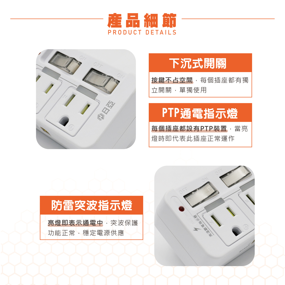 符合BSMI新安規V防雷擊突波保護V下沉式獨立開關VPTP高溫斷電指示燈V本體防火耐熱材質V插座防火PC材質V兒童保護蓋,防誤觸▼商品規格品名:日亞 3孔2開2插分接器型號:R-51LC規格:3孔插2開關2插座主要材質:銅、PC塑膠使用電壓:AC110V 60HZ額定電壓:AC125V額定電流:15A額定容量:MAX 1650W最大突波吸收能量:25焦耳最大突波吸收電壓:2500V最大突波吸收電流:1200A製造日期:標示於包裝上產地:中國(台商製造,日本品質)保存期限:常溫保存10年驗證登錄:R64847 RoHS保固:新品瑕疵保固 ※使用前請先詳閱包裝上使用說明※圖片僅供參考,商品依實際供貨為準。※商品如有顏色區別,未特別說明則採隨機出貨,不供挑色。※商品如經拆封、使用、或拆解以致缺乏完整性及失去再販售價值時,恕無法退(換)貨!※產品文案為原廠(供應商)所提供,若有變動敬請參照實際商品為準。※請勿盜用圖片進行商業用途,違者必究