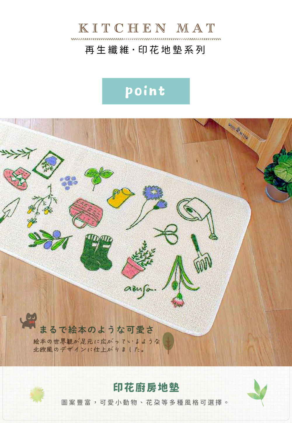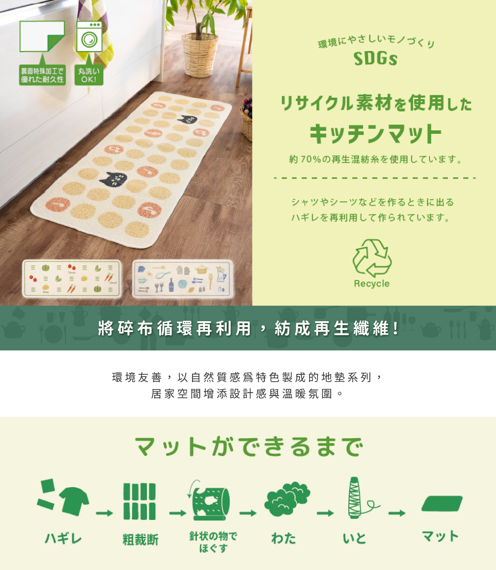 ●日本製顯色度良好的印製地墊―「印花廚房地墊」系列,是將製造襯衫等剩下的碎布再利用,重新紡成再生纖維,再印上豐富多樣的圖案,兼具環保與設計感。