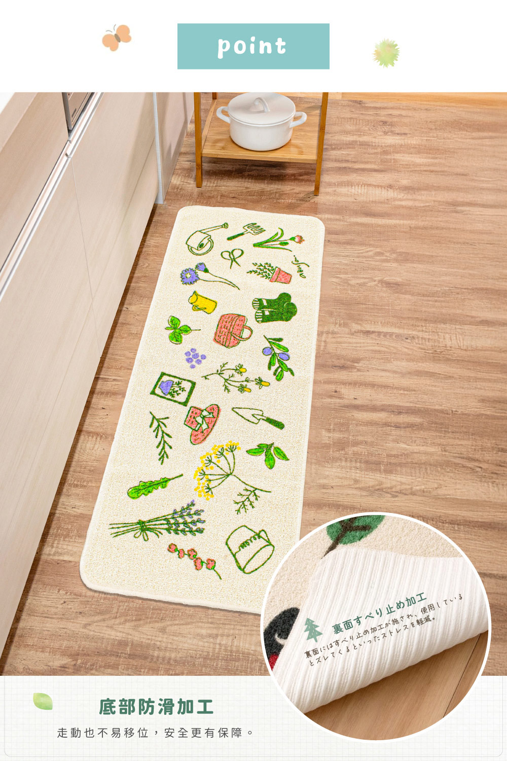 ●背面止滑加工,即使在廚房走動也不易移位,安全更有保障。