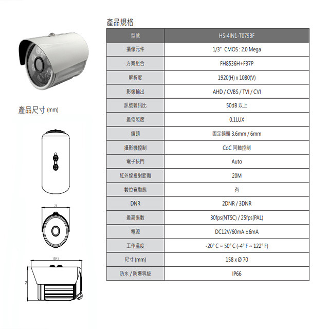 -高畫質影像 HD 1080P-高畫質影像傳送 – 畫面不壓縮,影像不延遲-超長傳輸距離-與原本類比系統架構相同,電纜線 ( 同軸 / 雙絞 ) 不需更換-固定鏡頭:3.6mm / 6mm-2DNR / 3DNR-CoC (UTC) 同軸控制 OSD 選單