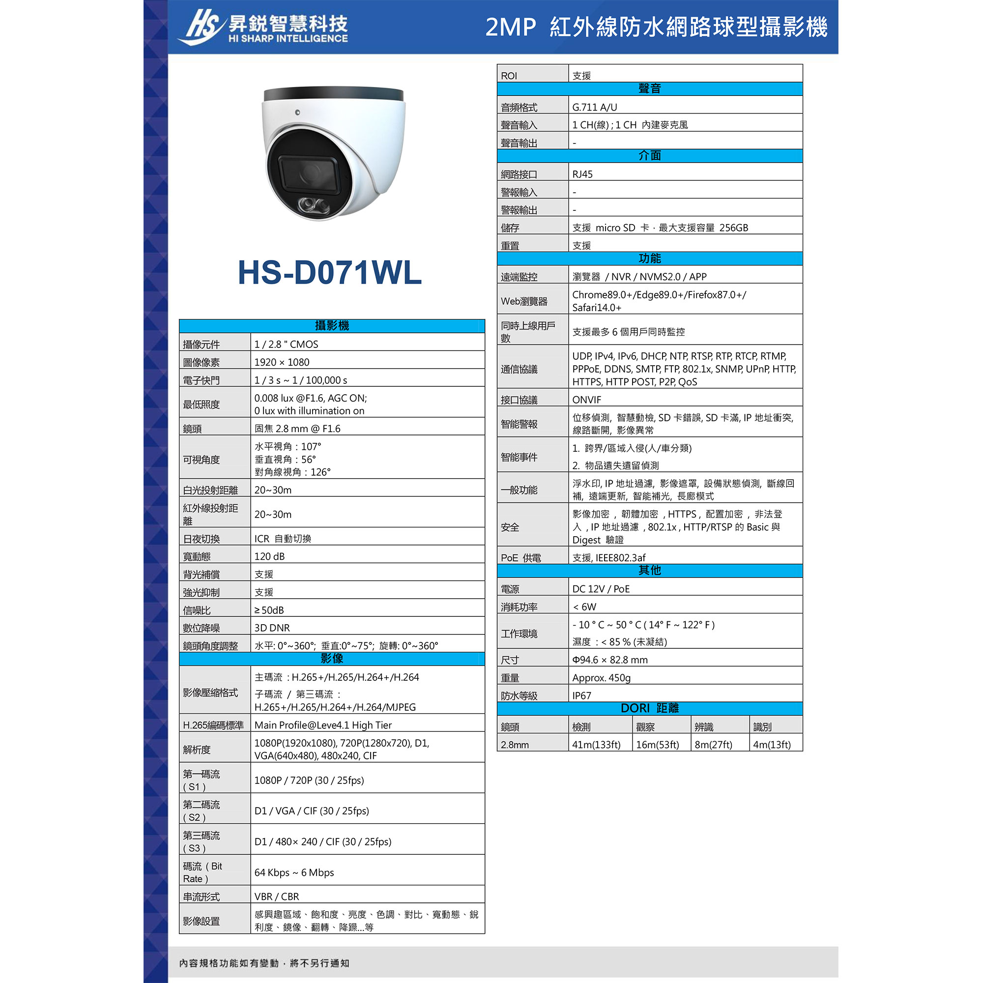 昌運監視器 昇銳 HS-D071WL 200萬畫素 半球型網路攝影機 紅外夜視距離20~30 m 支援PoE供電