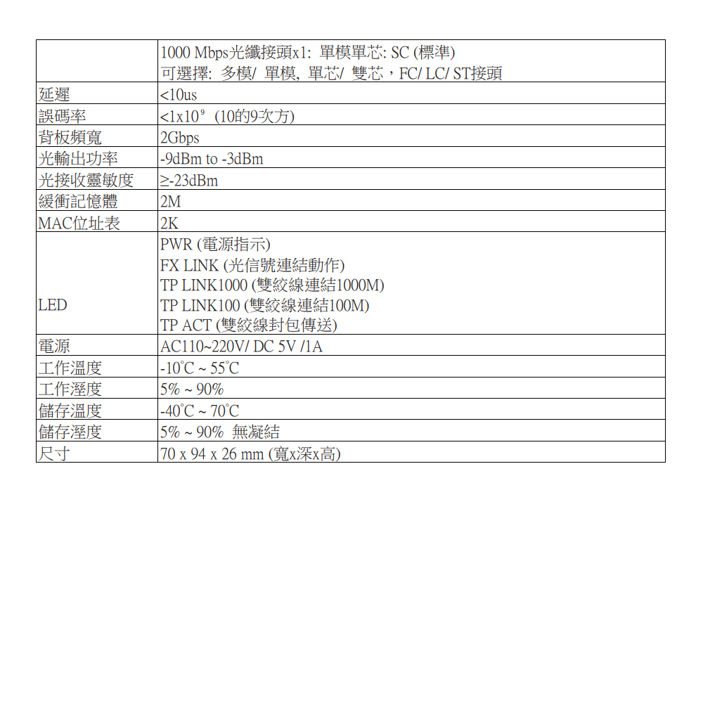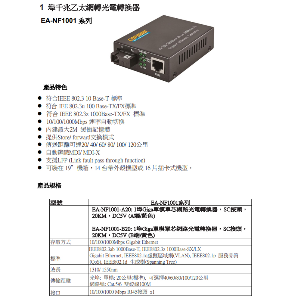 ⚫ 符合IEEE 802.3 10 Base-T 標準 ⚫ 符合 IEE 802.3u 100 Base-TX/FX標準 ⚫ 符合 IEEE 802.3z 1000Base-TX/FX 標準 ⚫ 10/100/1000Mbps 速率自動切換 ⚫ 內建最大2M 緩衝記憶體 ⚫ 提供Store/ forward交換模式 ⚫ 傳送距離可達20/ 40/ 60/ 80/ 100/ 120公里 ⚫ 自動辨識MDI/ MDI-X ⚫ 支援LFP (Link fault pass through function) ⚫ 可裝在 19”機箱,14 台帶外殼機型或 16 片插卡式機型。
