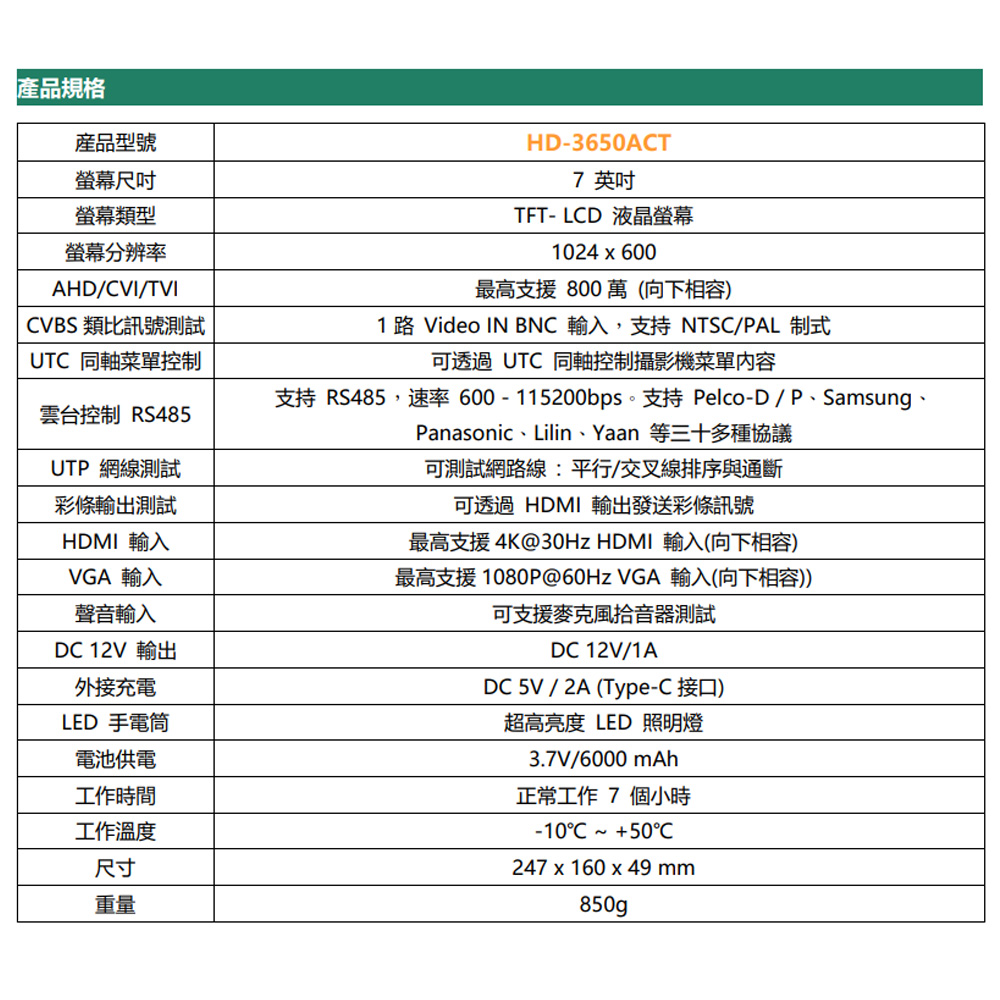 昌運監視器 HD-3650ACT 7吋 四合一 800萬 同軸型測試工程寶 支援HDMI彩條輸出