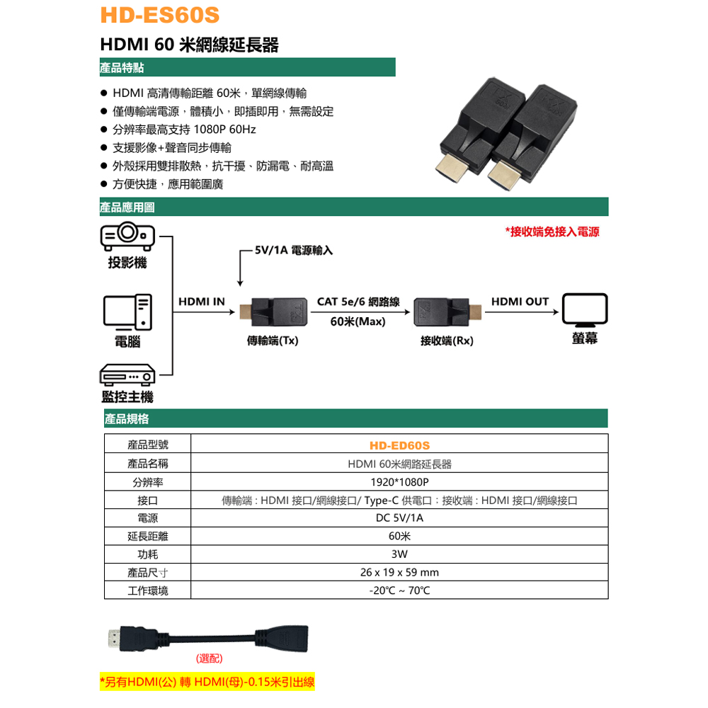 昌運監視器 HD-ES60S 60米HDMI網路延長器