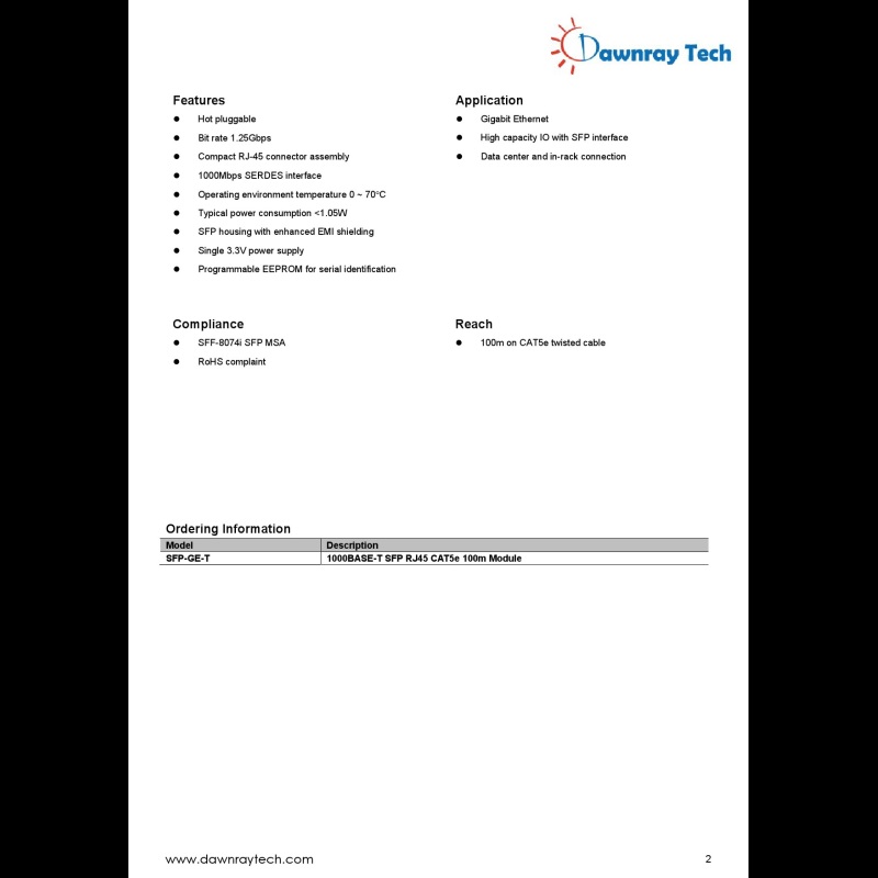 HPE H3C JD089B 相容銅纜收發模組, 主要應用於 1000BASE Ethernet 乙太網路, 是一種 1000Mbps 單通道小型可插拔式 SFP 模組. SFP GE-T 提供了高達 1Gb/s 的資料傳輸性能, 雙絞網路線 CAT5e 達 100 公尺. 此模組完全相容於多源協議 SFP Multi-Source Agreement (MSA), IEEE 802.3ab 1000BASE-T 及 SERDES 產業規範. 電信號介面為 MSA 相容之 20-pin 金手指板端連接器, 線端連接介面為 RJ45 接口. 全雙工 SFP 收發模組提供 1 Gbps 傳輸的高效能互連. 低功耗設計 (1.05W for 100m), 相容於各式主機端品牌, 於資料中心及企業機房獲得廣泛使用. 出廠時, 針對客戶應用環境的網路設備品牌, 進行相容性寫碼, 使其性能完全等效於原廠 HPE H3C JD089B 收發模組.