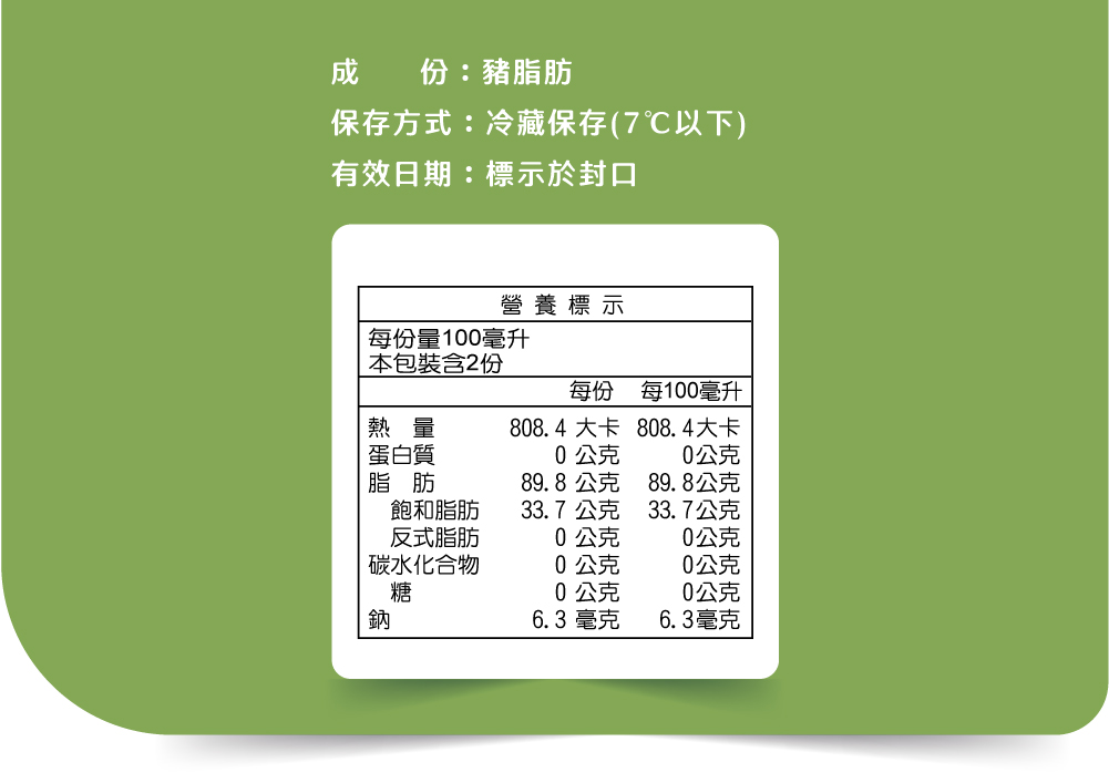 來自台灣安心飼養豬隻、獸醫把關、藥殘合格以水蒸氣120 °C慢熬提煉,完整保留豬油精華不高溫精煉,不調味,不加防腐劑,耐高溫180 °C高純度豬油,獨特香氣、入菜香醇,香味更升級,適合炒菜/煮湯/拌飯麵/各式料理料理用對油,增色添香,煮出餐廳感!