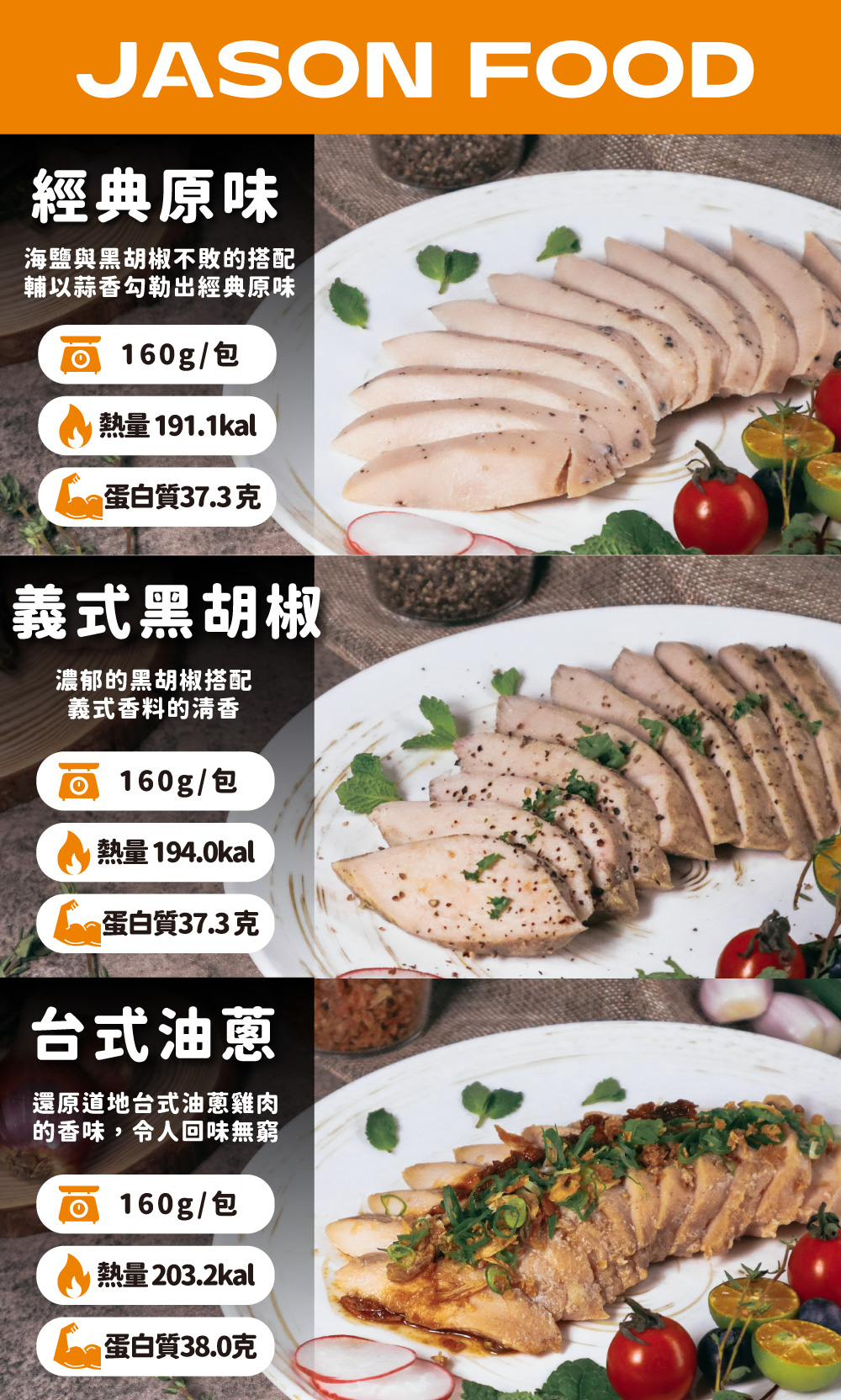 📢【杰森食代】全品項商品,單筆消費滿$1299享免運費📢【杰森食代─享受簡單美味 感受幸福滋味】 杰森以獨特的調理法調配出秘密配方,透過專業的溫度控制使雞胸肉鮮嫩多汁,打破您對雞胸調味單調的印象,簡單、方便、快速補充所需你的營養。📢產品:舒肥雞胸肉160g/包📢【源頭管理,食材把關】杰森食代擁有ISO22000暨HACCP食安系統認證選用新鮮國產安心雞,經過層層品質檢驗。從源頭把關,安全送到您的餐盤上。📢什麼是舒肥(Sous vide) ?舒肥法是一種通過低溫度長時間加熱的烹飪方法,目的是要帶出原料(尤其是肉類)的最佳效果,透過將空氣抽掉的方式避免食材因氧化而破壞品質,藉由對時間和溫度的精準控制,能讓食材均勻受熱,並保留住最多的養分、水分與自然風味,創造一份份幸福美味。
