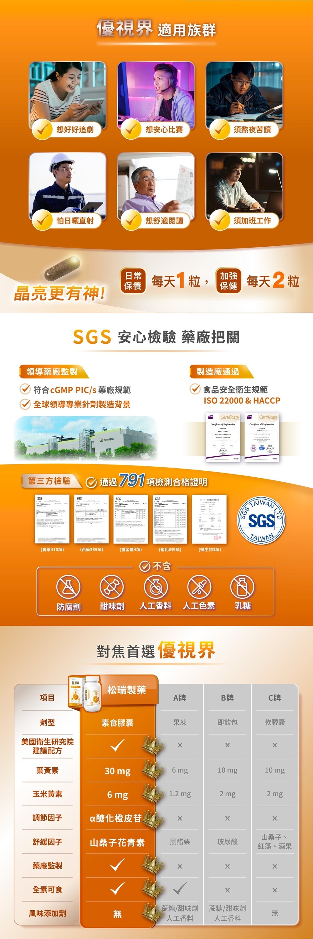 優視界 素食膠囊 60粒/入.獨家橙皮苷 應援閱讀高度.明亮|黃金比例:XanMax®游離型 葉黃素 + 玉米黃素 (5:1).舒緩|瑞士山桑子花青素.調節|日本α醣化橙皮苷.維生素A、C、E、鋅、銅 - 美國衛生研究院建議配方.領導藥廠和SGS把關 791項風險物質檢測合格.不含防腐劑、甜味劑、人工香料、人工色素、乳糖.全素清透膠囊 顆粒小好食用規格說明Q1: 每天攝取的葉黃素越多越好嗎?A1: 葉黃素食用過多可能會導致皮膚變黃。台灣政府規定葉黃素的每日上限為 30 毫克,優視界是安全無虞的。Q2: 優視界該怎麼吃呢?A2: 未滿 10 歲每日 1 粒。10 歲以上一般保養每日 1 粒;加強保健每日 2 粒。Q3: 市售保健食品常看到含有「葉黃素酯」,和葉黃素有什麼區別?A3: 「葉黃素酯」→ 非「純」的葉黃素。內含脂肪酸需要經消化代謝才能有效吸收Q4: 孕婦和哺乳媽媽可以吃優視界嗎?A4: 優視界不含防腐劑、甜味劑、人工香料、人工色素等,成分相對單純,適合孕婦及哺乳媽媽食用。