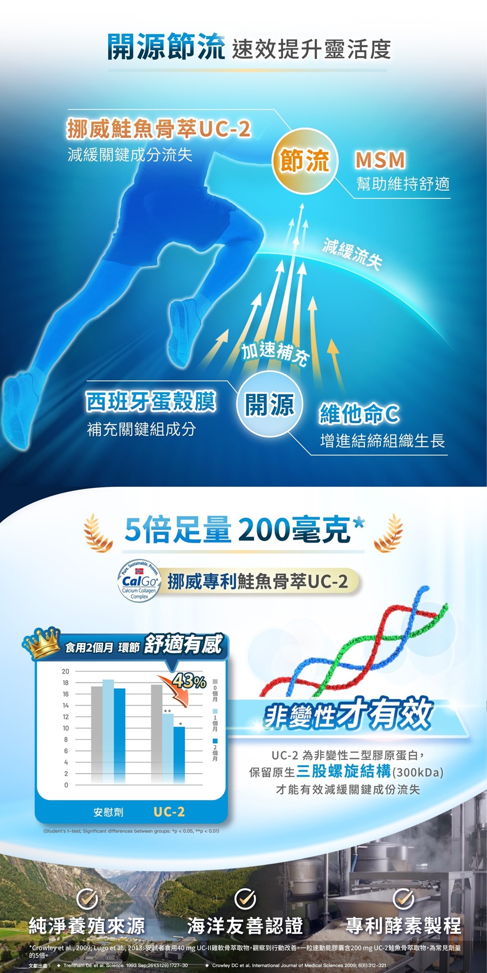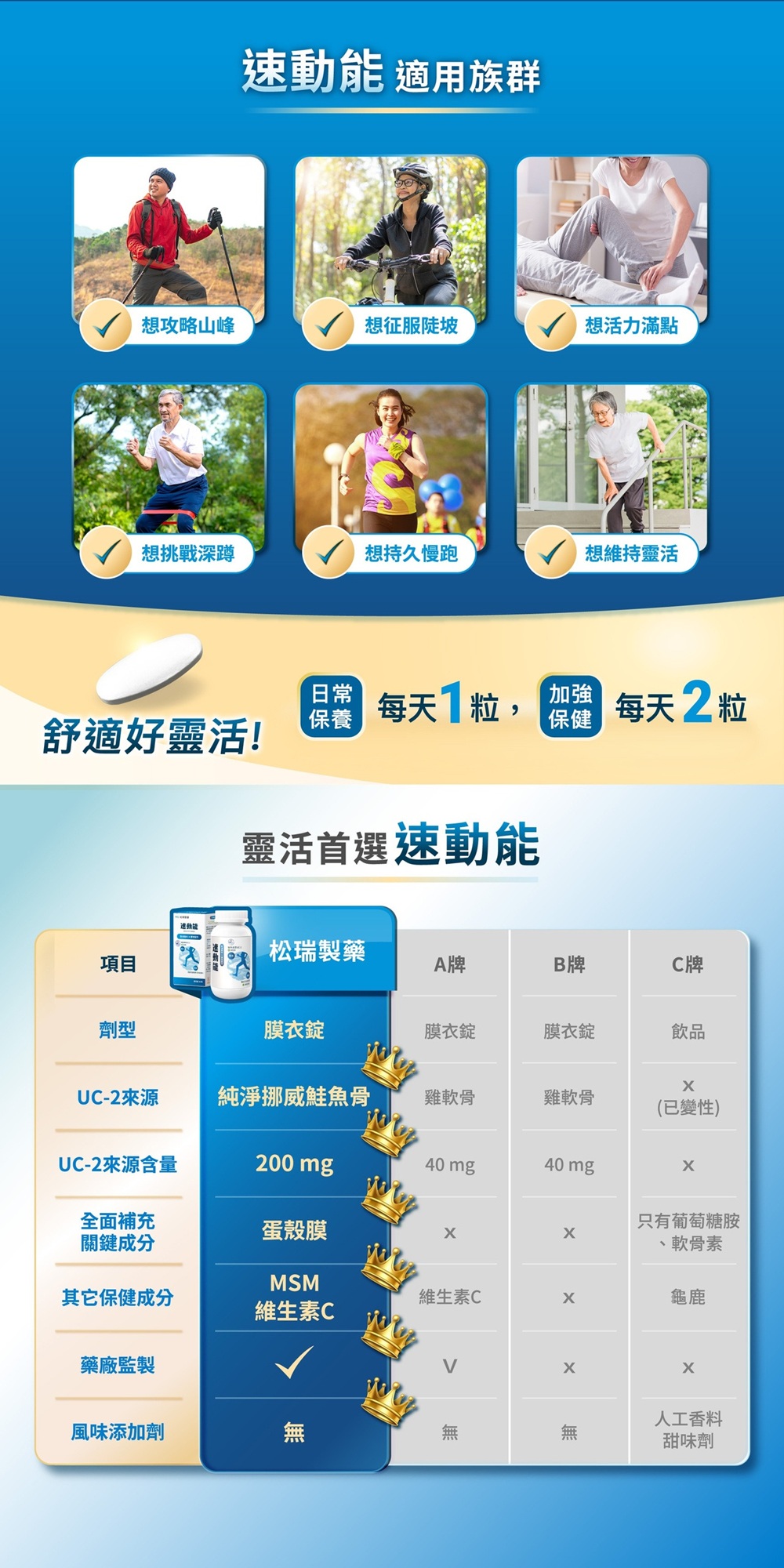 速動能 膜衣錠 60粒/入.5倍UC-2 幫助行動靈活.節流|CalGo®挪威鮭魚骨萃UC-2 + MSM.開源|西班牙蛋殼膜 + 維生素C.領導藥廠和SGS把關 791項風險物質檢測合格.不含防腐劑、甜味劑、人工香料、乳糖.濃縮高劑量 顆粒小好食用規格說明Q1: 速動能該怎麼吃呢?A1:日常保養每日 1 粒;加強保健每日 2 粒。因速動能含有MSM可幫助維持精神旺盛,請避免於睡前食用。Q2: 速動能內UC-2含量高是安全的嗎? 市面多數建議吃40毫克A2: 非變性二型膠原蛋白屬於蛋白質一種,而每日建議攝取蛋白質含量為1.0g/體重,所以安全性高,不用擔心唷!Q3: 速動能嚴選鮭魚骨萃,而非市售常見雞軟骨粉,有什麼考量嗎?A3: 鮭魚軟骨來源的UC-2 純度更高,市售UC-II雞軟骨粉40毫克,實際UC-II含量僅3%,相當於只有 1.2 毫克的UC-II。 養殖鮭魚可避免來自動物用藥及重金屬汙染等風險,加上專利技術無使用有機溶劑萃取,安全性更高。Q4: 孕婦和哺乳媽媽可以吃速動能嗎?A4: 本產品含有蛋殼膜,美國FDA將其列為「公認安全(GRAS)」。仍建議先請醫事人員評估。Q5: 非變性二型膠原蛋白 與 水解二型膠原蛋白 差異 ?A5: 水解二型膠原蛋白,本身因為加熱變性,僅作用營養補充,無法有效減緩流失及提升環節靈活。