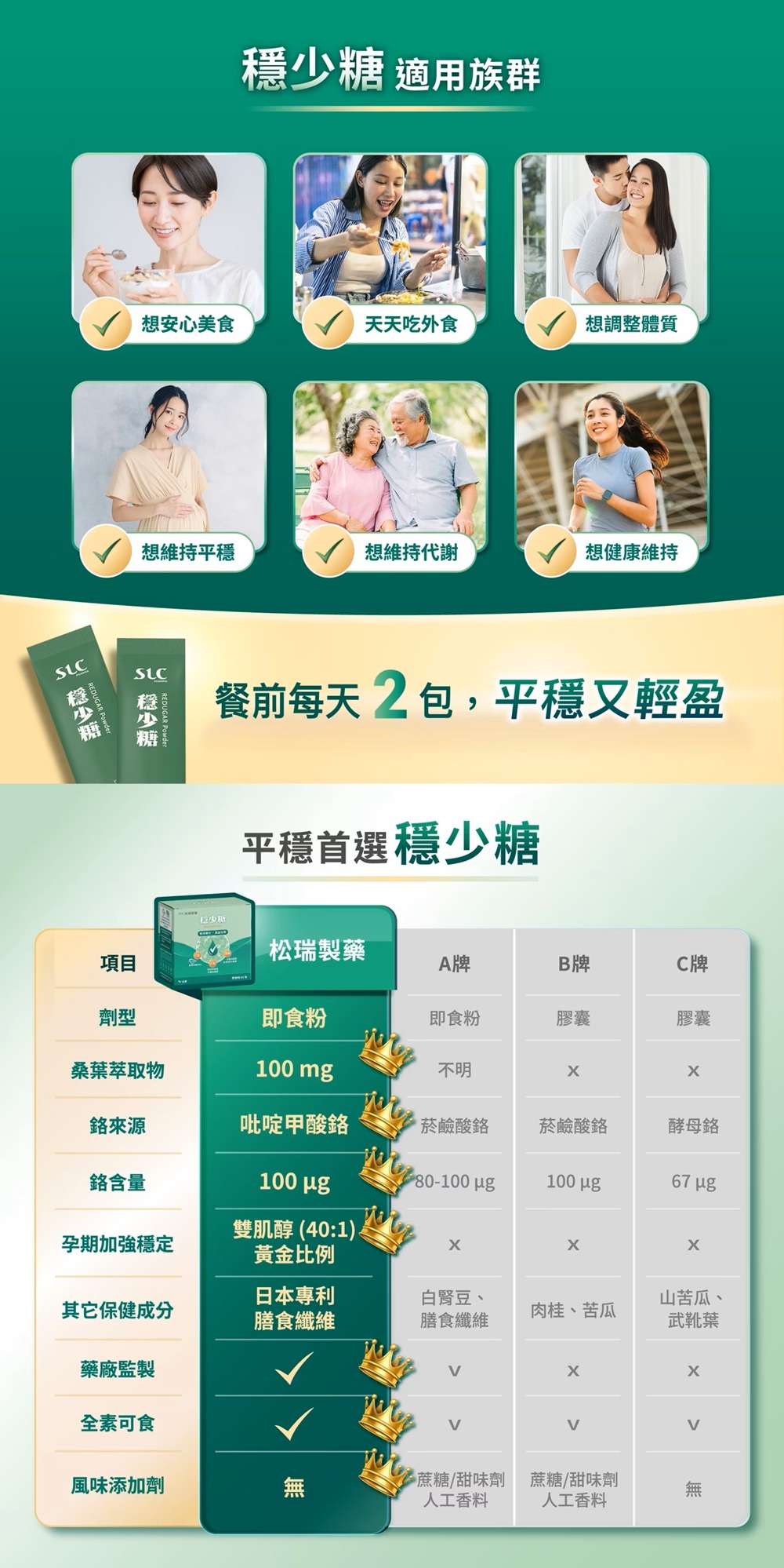 穩少糖 即食粉 60包/入.榮獲食品界奧斯卡【Monde Selection世界品質評鑑】金牌獎!.桑葉DNJ 支援餐後穩定.立即阻斷|Reducose®英國桑葉萃取DNJ.持續穩控|吡啶甲酸鉻 + 膳食纖維.孕婦有效|黃金比例:M肌醇 + DC肌醇 (40:1).領導藥廠和SGS把關 791項風險物質檢測合格.不含防腐劑、甜味劑、人工香料、人工色素、添加糖.無調味即食粉 便攜帶好食用規格說明Q1: 穩少糖的食用方式為何?A1: 每日2次,每次1包。用餐前或搭配餐點食用。Q2: 如果服用降血糖藥,穩少糖需要停用嗎? A2: 藥物無論餐前/後服用,都建議與食物錯開30分鐘。 穩少糖屬於食品,安全性高,不須停用,只要與藥物錯開食用即可。Q3: 穩少糖內含有肌醇,孕哺期間可以食用嗎?A3: 可以!肌醇為水溶性維生素,可調理孕期穩定平衡 不會增加早產或子宮收縮風險,造成宮縮是三磷酸肌醇,不同於食物來源肌醇。 但過量攝取 (12g以上/日) ,可能會有腸胃不適,若仍有疑慮,可諮詢醫事人員評估。Q4: 桑葉DNJ 跟 苦瓜胜肽 差異?A4: 桑葉DNJ 因結構似醣類,透過競爭分解達到抑制吸收,穩定餐後波動,安全性高,且快速調節。 苦瓜胜肽 為長期調節敏感部,但易受到消化過程破壞,且不建議孕婦食用,增加流產風險,建議由醫事人員評估。Q5: 穩少糖是否含有糖份呢? 口感如何?A4: 沒有!來自於肌醇的味道,口感微甜好入口,但100%無添加糖。