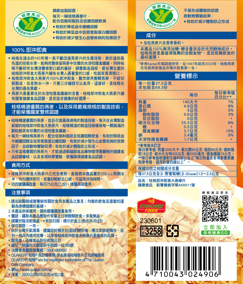 1/21-2/24 桂格即食大燕麥片2600g 2件$618(不得與折價券/折扣碼併用)