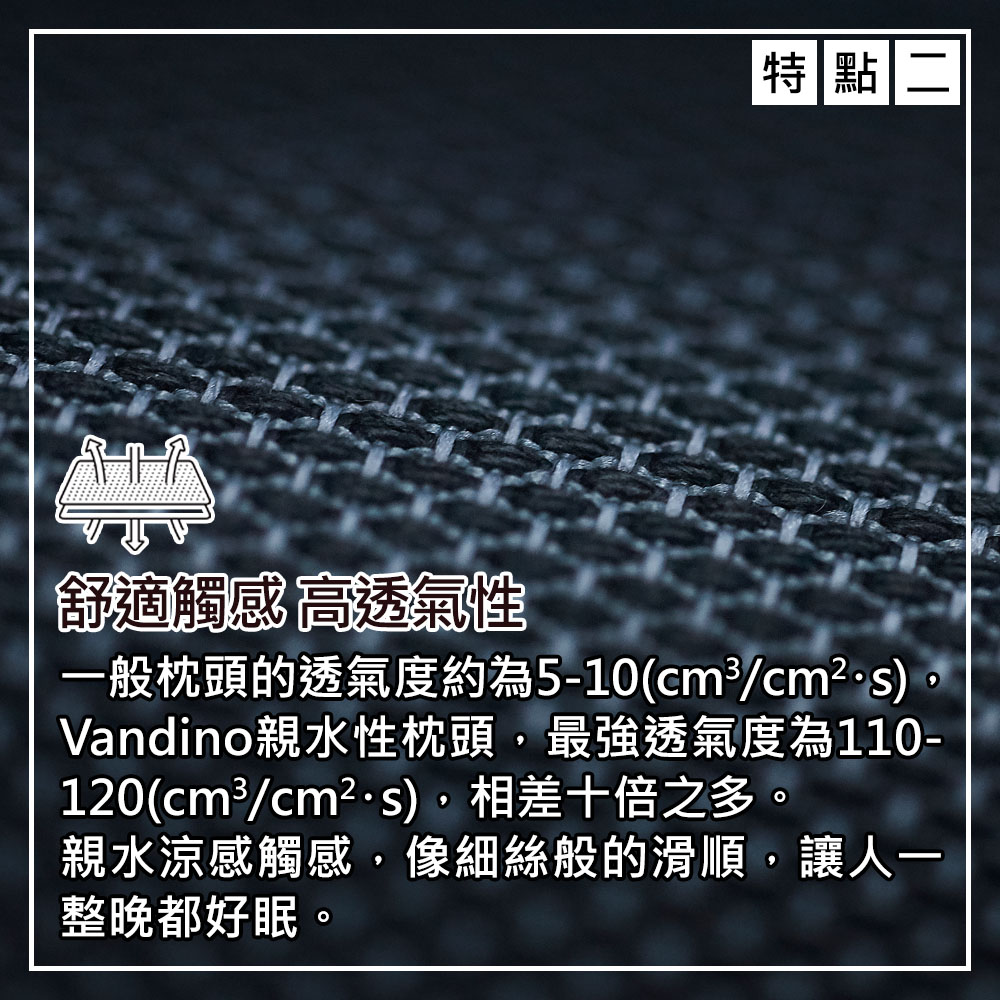 舒適觸感,高透氣性:一般枕頭的透氣度約為5-10(cm立方/cm平方・s),Vandino親水性枕頭,最強透氣度為110-120(cm立方/cm平方・s),相差十倍之多。
