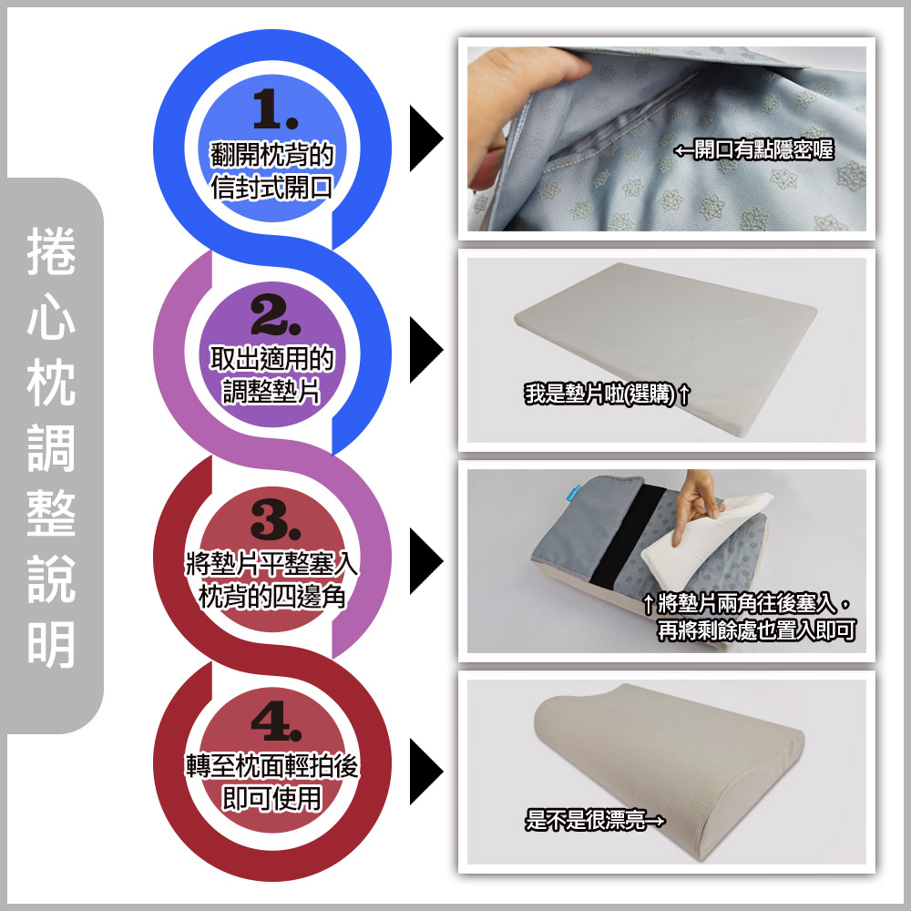 可加購調整墊片(調整高低):枕頭共有三種高度可供選擇,對於高度有調整需求或一枕供多人使用時,可自行加購調整墊片。