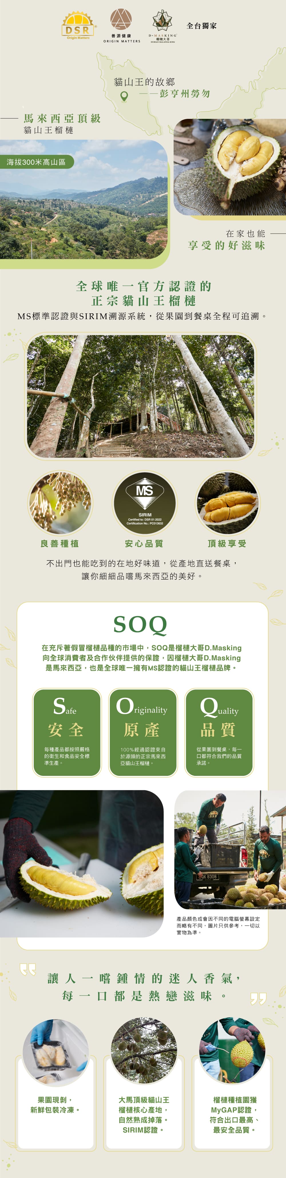 全球唯一一家經馬來西亞政府官方認證的貓山王品牌,嚴格把關,品質保證,只有我們 D.Masking 的貓山王符合貓山王榴槤標準,D.MasKing 是您的尊貴首選。