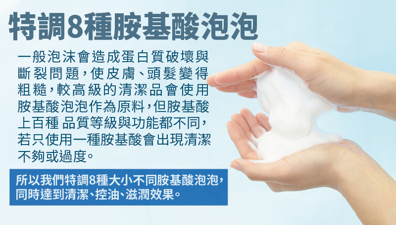 高濃縮氨基酸起泡成分為基底,弱酸性平衡油脂分泌,揮別過度清潔的惡性循環。極細緻泡沫洗淨,頭皮清爽,髮絲自然持久蓬松。