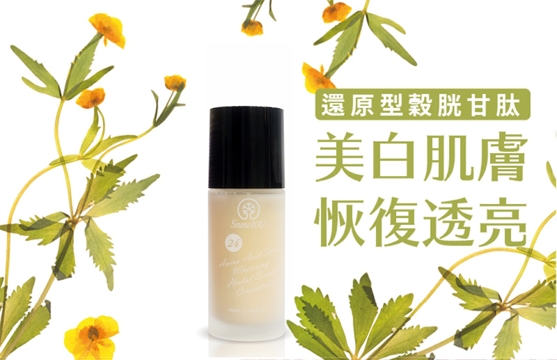 24胺基酸穀胱甘肽美白精華50ml以科技型24種複合基酸,結合啤酒花美白專利及多種植萃成分,改善肌膚暗沉,保濕水潤,維持肌膚柔嫩透亮白成分 :WATER 水、 NIACINAMIDE 煙醯胺、SODIUM HYALURONATE 透明質酸鈉、DIPROPYLENE GLYCOL 雙丙甘醇、TRANEXAMIC ACID 凝血酸、PROPANEDIOL 1,3-丙二醇、CAPRYLIC/CAPRIC TRIGLYCERIDE 辛酸/癸酸甘油三酯、SPIRAEA ULMARIA FLOWER EXTRACT 榆繡線菊(SPIRAEA ULMARIA)花提取物、 HYDROXYPROPYL GUAR 羥丙基瓜兒膠、TAURINE 牛磺酸、ASPARTIC ACID 天冬氨酸、THREONINE 蘇氨酸、ASPARAGINE 天冬醯胺、 GLUTAMIC ACID 谷氨酸、GLUTAMINE 穀氨醯胺、PROLINE 脯氨酸、GLYCINE 甘氨酸、ALANINE 丙氨酸、CITRULLINE 瓜氨酸、VALINE 纈氨酸、CYSTEINE 半胱氨酸、METHIONINE 蛋氨酸、 ISOLEUCINE 異亮氨酸、ARGININE 精氨酸、HISTIDINE 組氨酸、LEUCINE 亮氨酸、LYSINE 賴氨酸、PHENYLALANINE 苯丙氨酸、SERINE 絲氨酸、TRYPTOPHAN 色氨酸、TYROSINE 酪氨酸、ORNITHINE 鳥氨酸、MAGNESIUM PCA PCA 鎂、CREATINE 肌酸、 COPPER TRIPEPTIDE-1 三肽-1 銅 GLUCOSAMINE HCL 殼糖胺 HCl、PHENOXYETHANOL 苯氧乙醇、PEG-35 CASTOR OIL PEG-35 蓖麻油、POLYSORBATE 20 聚山梨醇酯-20、AESCULUS HIPPOCASTANUM (HORSE CHESTNUT) SEED EXTRACT 歐洲七葉樹(AESCULUS HIPPOCASTANUM)籽提取物、TOCOPHEROL維生素、E INOSITOL 肌醇、CALCIUM PANTOTHENATE 泛酸鈣、LINOLEIC ACID 亞油酸、BIOTIN 生物素、CHLORPHENESIN 氯苯甘醚、CYANOCOBALAMIN 氰鈷胺、 DISODIUM EDTA EDTA 二鈉 o-CYMEN-5-OL o-傘花烴-5-醇、ANIBA ROSAEODORA (ROSEWOOD) WOOD OIL 玫瑰木(ANIBA ROSAEODORA)木油、SODIUM ASCORBYL PHOSPHATE 抗壞血酸磷酸酯鈉、PYRIDOXINE HCL 吡哆素 HCl、HUMULUS LUPULUS (HOPS) STROBILE 啤酒花(HUMULUS LUPULUS)孢子葉球、PALMARIA PALMATA EXTRACT 掌葉樹(PALMARIA PALMATA)提取物、GLUTATHIONE 穀胱甘肽用途 : 潤澤亮白肌膚使用方式 : 臉部清潔後,取適量使用於臉部及頸部,以指腹輕輕至吸收容量 : 50ml注意事項 : 如出現異常現象時,請停止使用。如異常感持續,請洽詢醫生。保存方式 : 請勿存放於高溫及潮濕處、嬰幼兒可拿取處,並避免太陽直射。開封後請早使用完畢。保存期限 : 三年產地 : 台灣