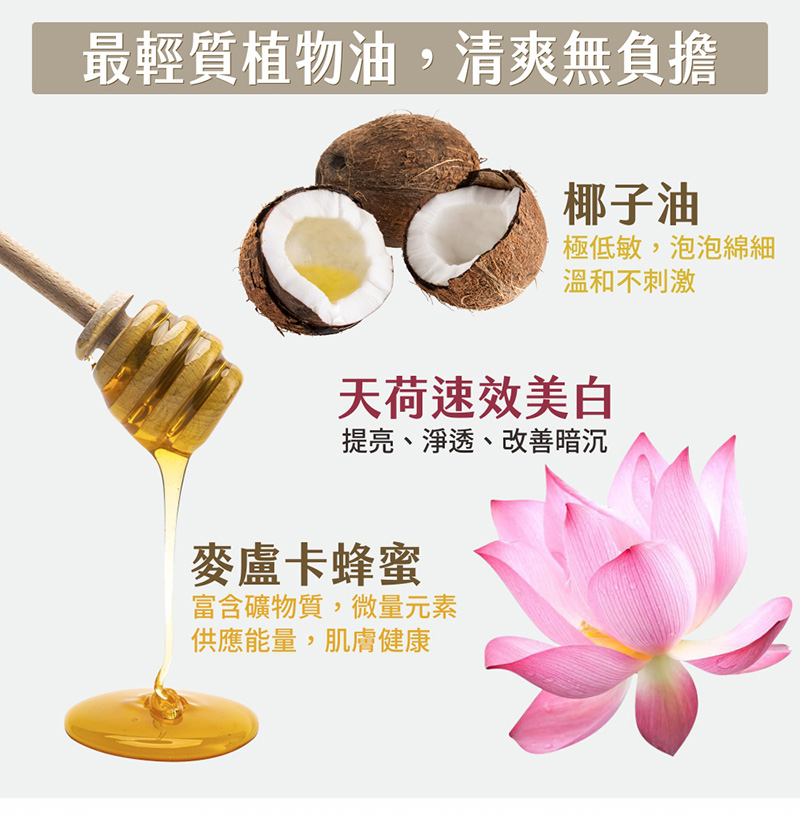 含天然保濕因子,適合天天使用。深層潔淨功效,可徹底清潔殘垢及老化角質,維持毛孔深層清潔 洗後肌膚不緊繃,親水性配方更容易洗淨, 並使肌膚保持應有的水份與濕潤感,保濕亮白成分,不刺激肌膚。成份 : Aqua 水、Sodium Laureth Sulfate 月桂醇聚醚硫酸酯鈉鹽、Glycerin 甘油、Potassium Cocoyl Glycinate 椰油酷甘氨酸鉀、Cocamidopropyl Hydroxysultaine 椰油醯胺丙基羥基磺基甜菜堿、Peg-120 Methyl Glucose Trioleate PEG-120甲基葡糖三油酸酯、Phenoxyethanol 苯氧乙醇、Caprylyl Glycol 辛乙二醇、Lactic Acid 乳酸、Sea Salt 海鹽、Propanediol 1,3-丙二醇、Citrus Aurantium Dulcis (Orange) Peel Oil 甜橙皮油、Ricinus Communis (Castor) Oil 蓖麻油、Pelargonium Graveolens Oil 香葉天竺葵油、Tartaric Acid 酒石酸、Disodium Edta 乙二胺四乙基二鈉、Sodium Metabisulfite 重亞硫酸鈉、Sodium Sulfite 亞硫酸鈉、Honey Extract 蜂蜜萃取、Cocamidopropyl Dimethylamine 椰油醯胺丙基二甲胺、Cymbopogon Martini Oil 玫瑰草油、Citrus Grandis (Grapefruit) Peel Oil 柚皮油、Mentha Piperita (Peppermint) Oil 辣薄荷油、Ocimum Basilicum (Basil) Oil 羅勒油、Pogostemon Cablin Oil 廣藿香油、Eugenia Caryophyllus (Clove) Bud Oil 丁香花蕾油、Butylene Glycol 丁二醇、Psidium Guajava Fruit Extract 芭樂果萃取、Carica Papaya (Papaya) Fruit Extract 番木瓜果萃取、Saxifraga Sarmentosa Extract 草莓虎耳草萃取