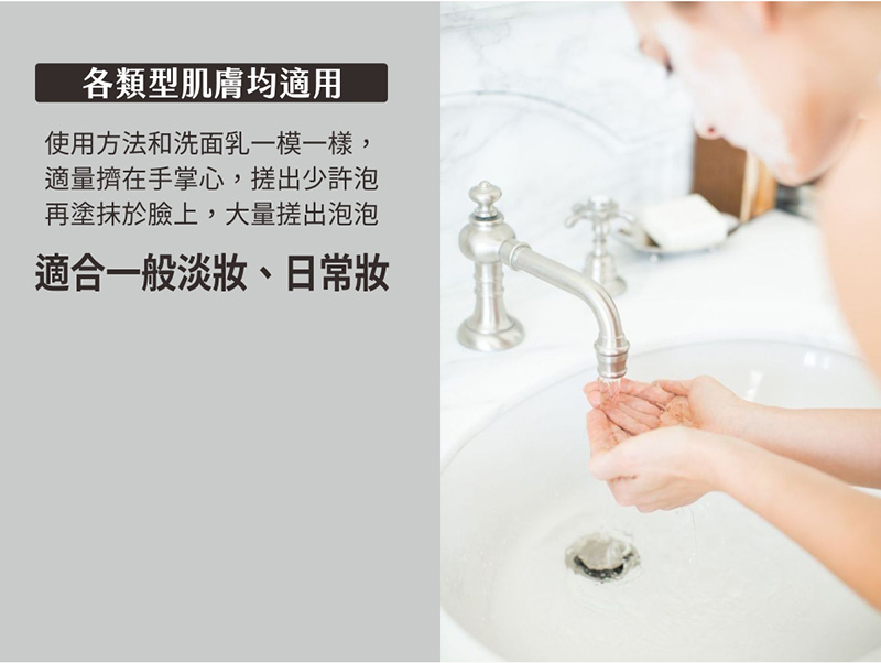 用 途 : 臉部卸妝、清潔使用方式 : 卸妝 : 雙手微濕,取適量于全臉按摩清除彩妝,以清水潔淨洗臉 : 取適量加水混合起泡,全臉輕柔按摩清潔,再以清水潔淨容量 : 165ml注意事項 : 如出現異常現象時,請停止使用。如異常感持續,請洽詢醫生。保存方式 : 請勿存放於高溫及潮濕處、嬰幼兒可拿取處,並避免太陽直射。開封後請儘早使用完畢。有效期間:三年產地:台灣