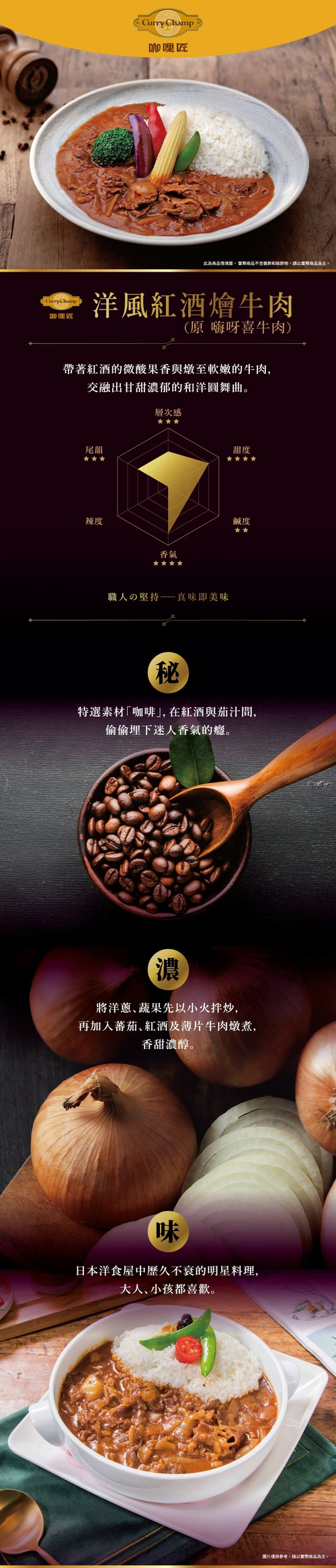 洋蔥、雞湯(水、雞骨)、牛肉(美國)、蕃茄糊[蕃茄泥(蕃茄糊、水)、檸檬酸]、咖哩醬[麵粉、豬油、焦化洋蔥(豬油、洋蔥、水)、乳糖、食鹽、砂糖、第一類普通焦糖色素、番茄粉、香蕉、調味劑(L-麩酸鈉、5'-次黃嘌呤核苷磷酸二鈉、5'-鳥嘌呤核苷磷酸二鈉、琥珀酸二鈉)、醬汁粉(砂糖、糊精、食鹽、洋蔥粉、丁香、咖啡、辣椒、胡椒、肉桂、肉豆蔻、鼠尾草粉、蘋果汁粉)、雞高湯粉(棕櫚油、火雞油、蔬菜泥(菜籽油、洋蔥)、植物性蛋白水解物、香辛料(鼠尾草、胡椒、薑黃))、脫脂奶粉、葡萄糖、酸味劑(檸檬酸、DL-蘋果酸、醋酸鈉、冰醋酸)、香料]、紅酒(葡萄)、洋蔥醬(洋蔥、紅蘿蔔、大豆油、蒜)、蕃茄醬[水、蕃茄糊、蔗糖、釀造醋、鹽、香辛料(白胡椒、肉桂、紅辣椒、薑、丁香、肉豆蔻、芥末、月桂葉、眾香子)]、奶油(殺菌乳脂)、醬油、糖色(蔗糖、砂糖、水、鹽)、大豆油、大蒜、咖啡(即溶咖啡、咖啡豆萃取物)、鹽、巧克力(可可、糖、肉桂、薑、香草豆莢)