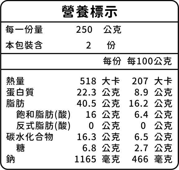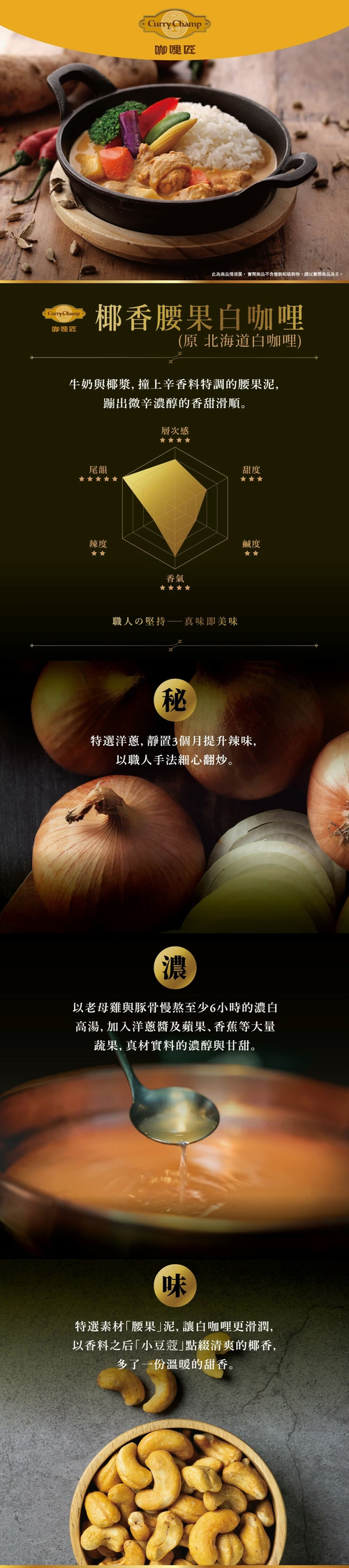 雞肉、雞湯(水、雞骨)、洋蔥、水、椰漿(椰漿、水、玉米糖膠、阿拉伯膠、脂肪酸蔗糖酯、偏亞硫酸氫鈉(漂白劑))、腰果、白醬(牛奶、麵粉、奶油、鹽、糖)、優格(牛奶、乳酸菌)、鮮奶油(奶脂、牛奶蛋白、鹿角菜膠)、奶油(殺菌乳脂)、大豆油、薑、大蒜、鹽、雞高湯[水、鹽、雞肉萃取物(雞肉萃取物、鹽)、L-麩酸鈉、糖、雞油、酵母萃取物(酵母萃取物、鹽)、乙醯化己二酸二澱粉、香料、調味劑(5'-次黃嘌呤核苷磷酸二鈉、5 '-鳥嘌呤核苷磷酸二鈉)、明膠、玉米糖膠、β胡蘿蔔素(麥芽糊精、辛烯基丁二酸鈉澱粉、葵花油、抗氧化劑(L-抗壞血酸鈉、維生素C、維生素E)、β胡蘿蔔素)]、紅椒粉、胡荽粉、咖哩粉(薑黃、胡荽、葫蘆巴、孜然、橘皮、辣椒、肉桂、茴香、薑、八角、百里香、月桂葉、丁香、肉豆蔻、鼠尾草、荳蔻)、雞粉[鹽、麥芽糊精、L-麩酸鈉、糖、玉米澱粉、雞肉粉、香料、酵母萃取物(酵母萃取物、鹽)、雞油、棕櫚油、調味劑(5'-次黃嘌呤核苷磷酸二鈉、5 '-鳥嘌呤核苷磷酸二鈉)、白胡椒]、蠔油[水、糖、蠔汁(蠔、水、鹽)、鹽、粘稠劑(羥丙基磷酸二澱粉)、調味劑(L-麩酸鈉)、小麥粉、著色劑(焦糖色素)]、起司粉(殺菌牛乳、乳酸菌、鹽、凝乳酵素)、小豆蔻、小茴香