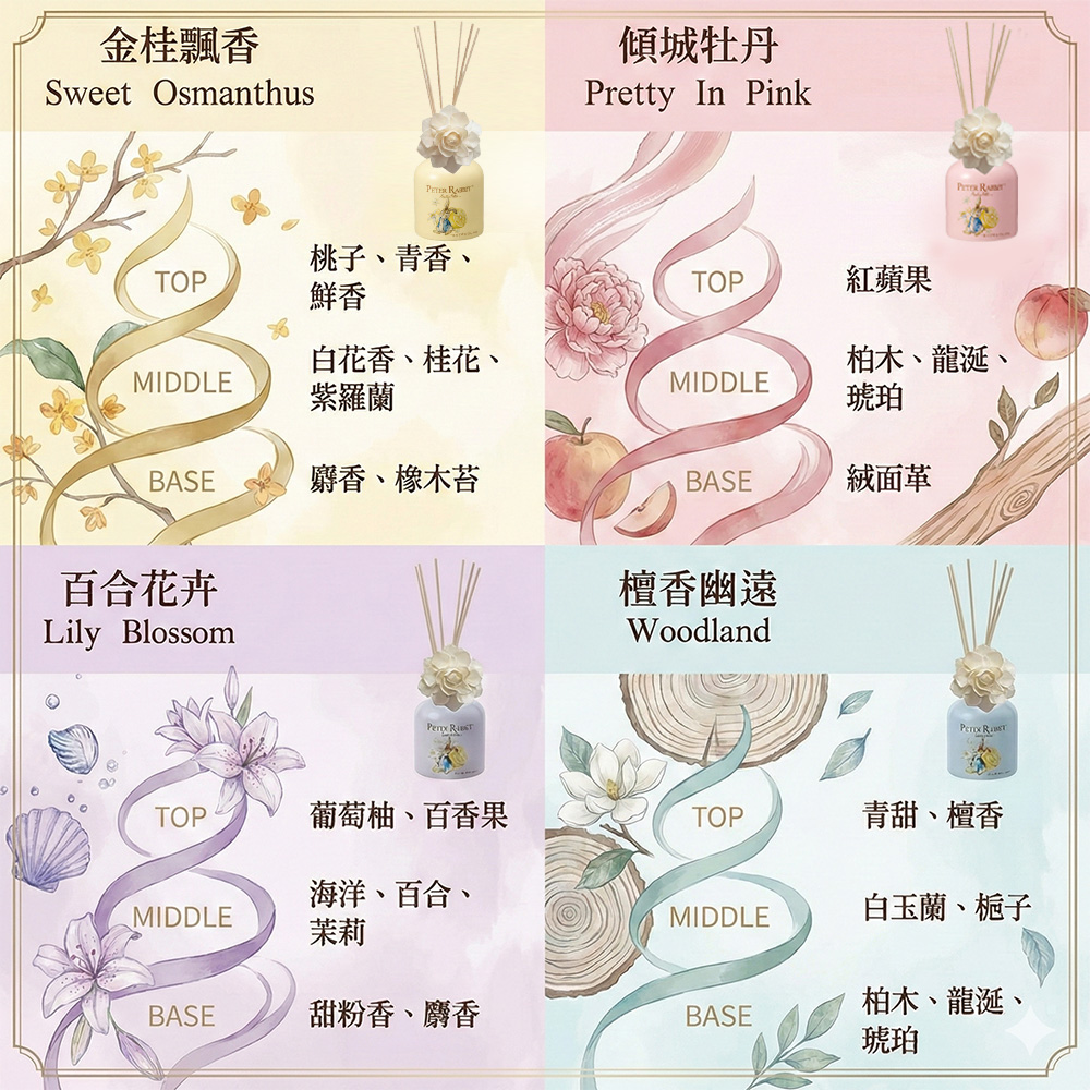 ★ 居家生活4款療癒香氛★充滿浪漫慵懶氣息宅在家療癒身心★讓家中每個角落都充滿芬芳★根據個人喜好選擇適合的香氛,即可營造出不同的氛圍與情境★搭配8支優雅的藤枝,持續透過香氣提升空間品味,送禮自用皆適宜★簡約的居室擴香瓶,來自比得兔英式田園風格為空間增添純淨迷人的香氣!