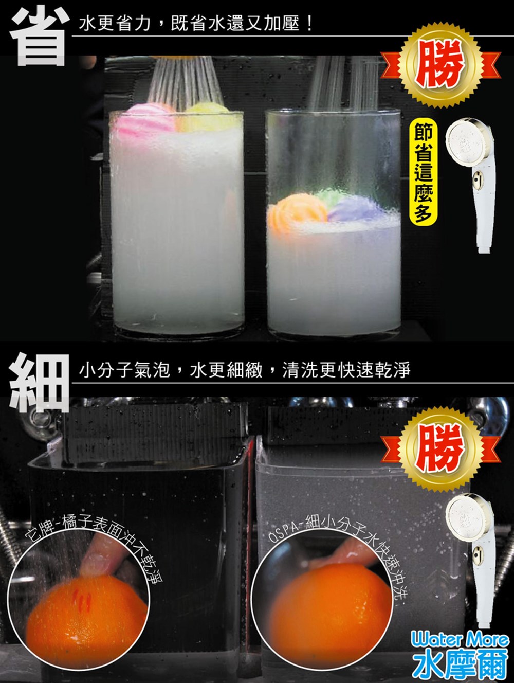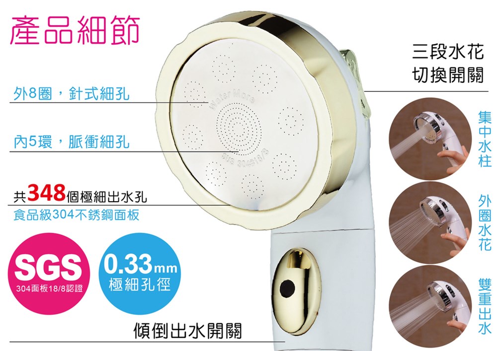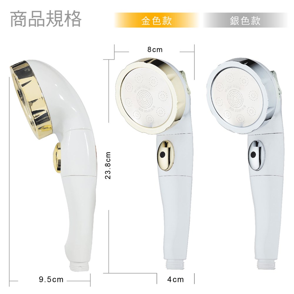 水摩爾三段增壓掉落自動止水安全蓮蓬頭商品型號:WM-588商品材質:ABS、不鏽鋼面板商品尺寸:全長23.8cm、噴頭直徑8cm、握柄寬4cm商品重量:220g顏色:金白配色、銀白配色產地:中國注意事項:1. 傾倒時自動止水,請按住握柄出水鍵即可正常出水。2. 請勿刻意摔落蓮蓬頭測試止水功能,以免造成損壞。