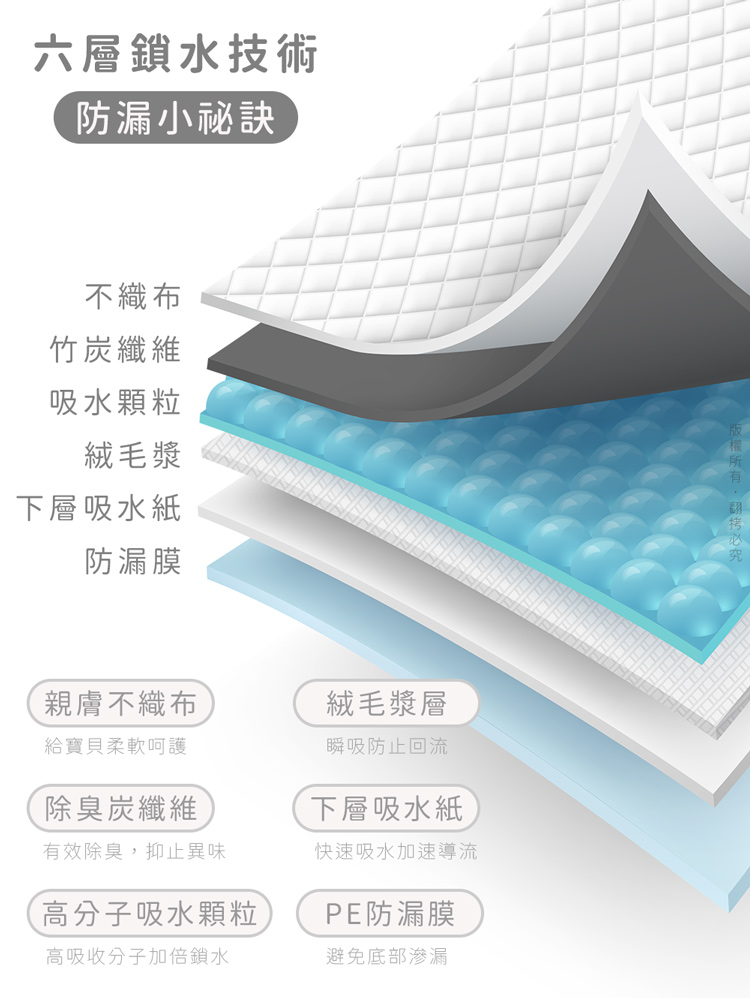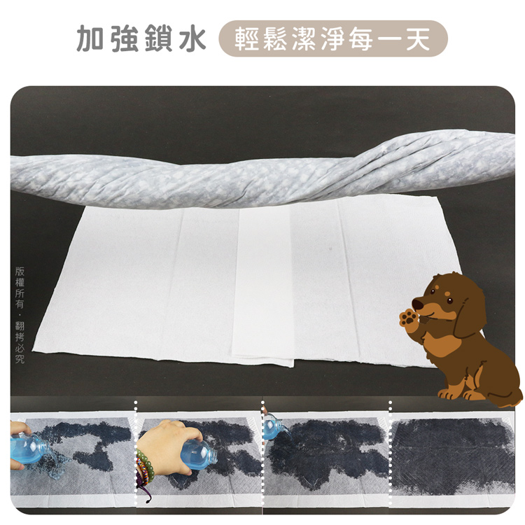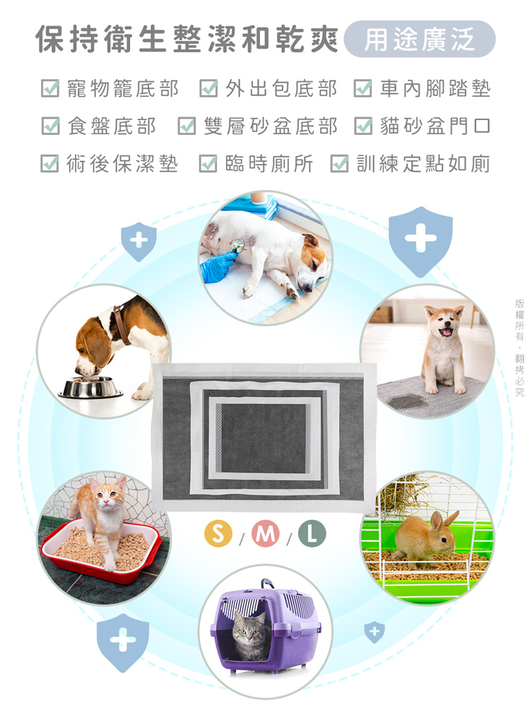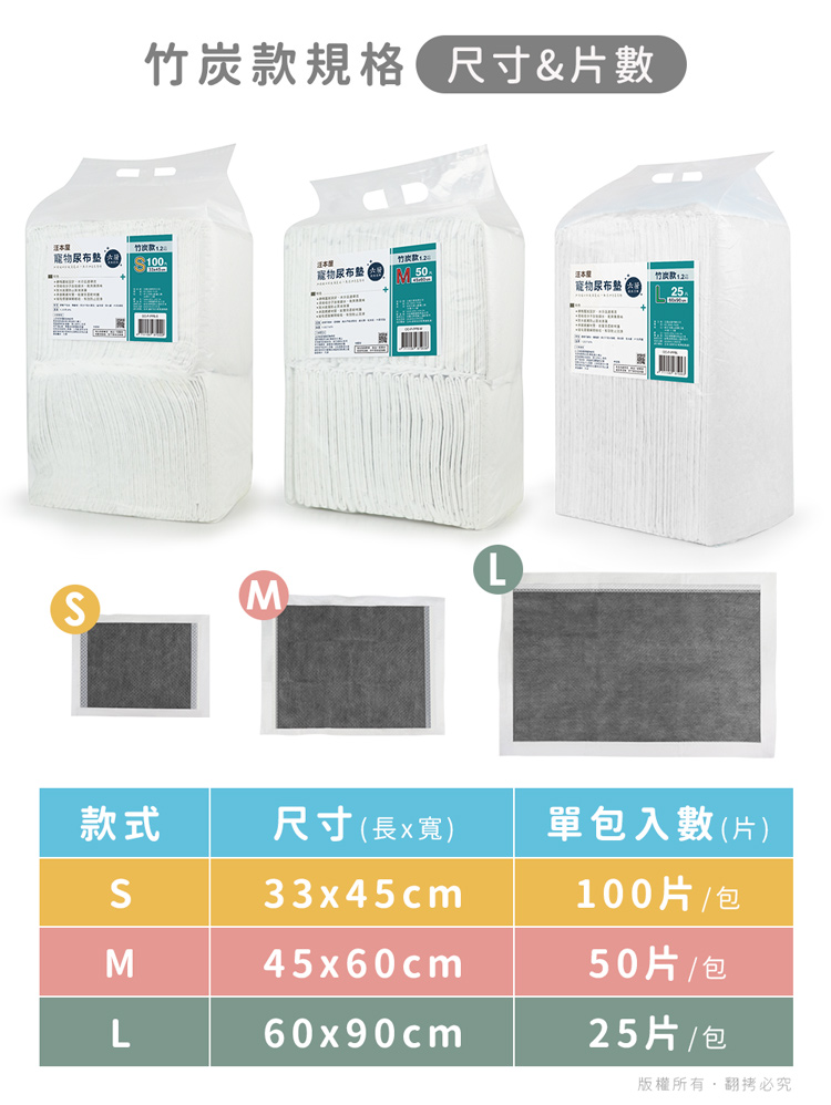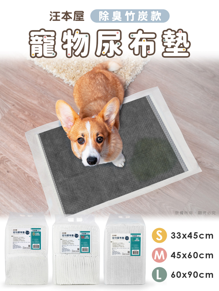 汪本屋 除臭竹炭款 寵物尿布墊(S號/M號/L號)-6包 --六層鎖水技術,加倍鎖水乾爽無異味----無添加色素香料,狗/貓/鼠/兔…等皆適用-- 專為毛孩所設計的衛生用品,如海綿般吸水,尿液迅速導流,輕鬆潔淨每一天,強效鎖水防止尿液側漏,保持整潔乾淨 用途廣泛,除了可放於寵物籠底部,或雙層貓砂盆下層吸水之外,如果需要帶寵物外出時,也可置於寵物推車、外出籠、外出包…等擺放尿布墊於底部,可保持空間整潔! 六層鎖水技術,上層親膚不織布,給毛孩柔軟呵護,網格壓紋設計,水分迅速導流,除臭竹炭纖維層,有效吸附異味高分子吸水顆粒,瞬吸自身體積數倍重量水分,加倍鎖水絨毛漿層瞬間吸收,有效防止回滲,底部PE防水膜徹底杜絕液體滲漏! S號(33x45cm):幼犬/倉鼠籠/兔籠/外出包…等M號(45x60cm):中型犬/貓砂盆門口/雙層貓砂盆底層…等L號(60x90cm):大型犬/術後保潔墊/汽車踏墊…等 使用方式: 1.購買前,請先選擇適合寵物體型與擺放場所的尺寸 S號(33x45cm):幼犬/小型犬/倉鼠籠/兔籠/外出包…等 M號(45x60cm):中型犬/貓砂盆門口/雙層砂盆底層…等 L號(60x90cm):大型犬/術後保潔墊/汽車踏墊…等2.打開包裝後取出尿布墊,將不織布面朝上擺放。3.平鋪在平坦面或是寵物籠尿盆上即可開始使用。 如何訓練定點如廁: 1.請選擇能讓寵物安心及安撫的地點與空間,如廁所、寵物籠…等 在地點決定後,請勿隨意更換地點,免以造成寵物認知誤差!2.初始訓練時,當狗狗有想大/小便的徵兆時(轉圈圈、臂部蹲低…), 請立刻帶寵物至尿布墊擺放的場所。3.再訓練的過程中,請飼主給與耐心/讚美/獎勵,重覆動作是教育很重要的一環。 切勿以處罰的方式來進行訓練,否則可能造成寵物身、心受傷。4.狗狗上過幾次後,之後就會習慣去尿布墊上尿尿。5.在訓練過程中寵物如果至錯誤的地點大/小便,請確實清掃乾淨,切勿留下臭味。6.可搭配圍籬、誘導劑、禁區噴霧…等,幫助訓練過程順利。 注意事項: .本產品僅供寵物使用。.本商品為接觸型商品,為避免傳染性疾病(如:跳蚤/壁虱/疥癬…等) 一經開封或試用過,恕不受理更換事宜。.若尿布墊已被寵物拉扯斷裂時,請立即終止使用。.使用時請將不織布面朝上做用。.請勿將尿布墊丟入馬桶中,這將會導致排水管的堵塞。.購買前仔細詳閱商品規格尺寸,慎重購買,以免造成日後買賣糾紛。.尺寸與重量皆採手工測量,±5%誤差屬正常範圍。 轉載警示: 自民國108年6月1日起(含追溯既往),鈞嵐(立嵐)企業有限公司之 商品圖片、影片或鈞嵐(立嵐)企業有限公司文字及LOGO, 任何客戶或用戶需轉載刊登任何圖片、文字、影片 皆需經過鈞嵐(立嵐)書面同意,如有需求請與鈞嵐(立嵐)客服中心接洽聯絡。 若任何未經鈞嵐(立嵐)同意即任意轉載刊登者, 我司將進行相關智慧財產著作權與商標權及商業法的追訴權利。 商品規格: .型 號:OO-P-PPB-BOX.品 名:汪本屋 除臭竹炭款 寵物尿布墊.規 格:S號 33x45cm/片;M號 45x60cm/片;L號 60x90cm/片.單包入數:S號 100片/包;M號 50片/包;L號 25片/包.重 量:約 1200 g ±5% (單包).材 質:親膚不織布、竹炭纖維、高分子吸水顆粒、絨毛漿、吸水紙、PE防漏膜.包裝內含:S號 100片/包,共6包 M號 50片/包,共6包 L號 25片/包,共6包.商品保固:僅限新品瑕疪更可換商品