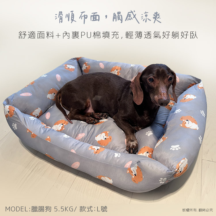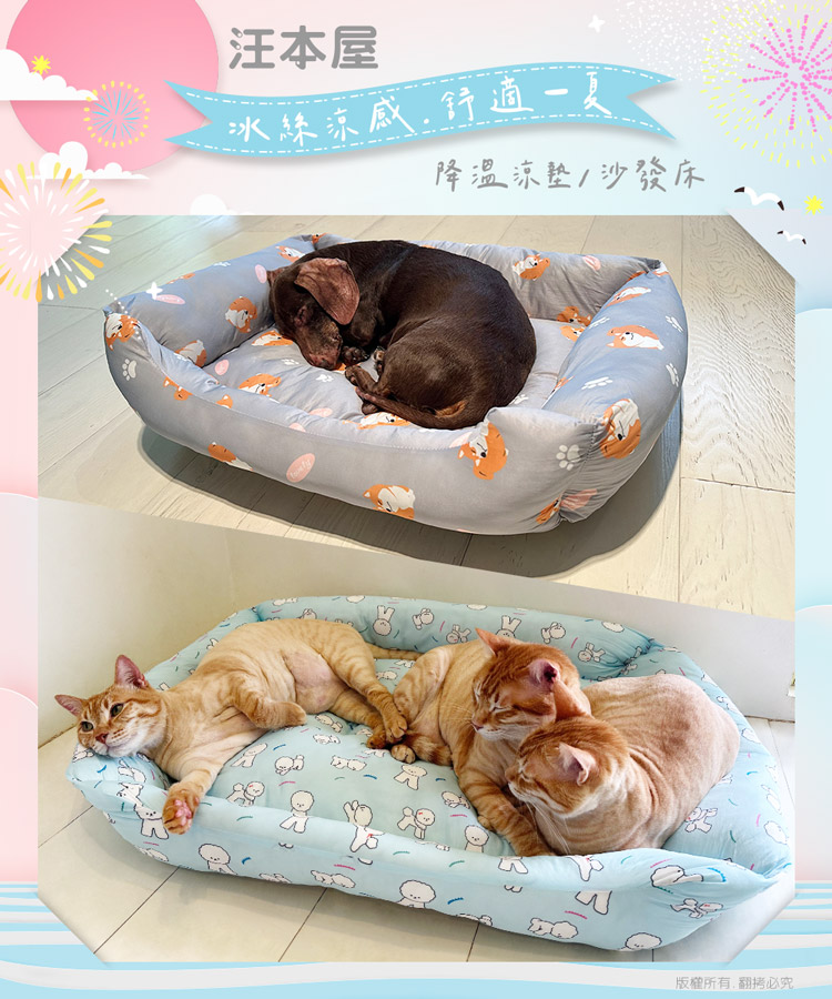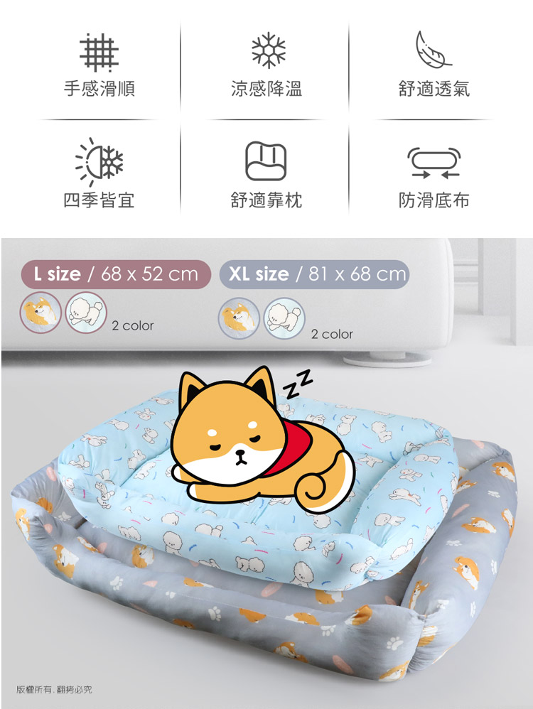 汪本屋 涼感降溫 冰絲寵物涼墊/沙發床(XL號)★貓狗適用★ --溫和迅速降溫,涼爽舒適,告別黏膩!-- 炎炎夏日,擔心冷氣費貴、更怕獨自留在家中的毛孩們太熱!尤其毛小孩的體溫又比人略高,除了通風的環境、提供充足的水份之外還能提供什麼避暑良方呢? 【涼感降溫 冰絲寵物涼墊/沙發床】,採用冰絲涼感面料,皮膚接觸這種面料,會感到冰涼滑順,夏天不再擔心毛小孩太熱,不用吹冷氣也可以涼涼的!絕對是今年夏天的不二選擇! 安全無害印染,可愛小狗圖案搭配雙色印刷,打造溫馨美感!舒適靠枕內部填充高回彈的PP棉,如雲朵般蓬鬆柔軟,舒爽靠著睡可直接放置於籠子、地板、沙發上…等,趕快使用降溫墊,讓毛小孩擁有一個涼爽的休憩環境吧! ※請避免使用尖銳物割刺、或是寵物啃咬,以免造成破損。※若沾染髒污時,請立即使用濕布擦拭,避免長時間滲透! 注意事項: .本商品為接觸型商品,為避免傳染性疾病(如:跳蚤/壁虱/疥癬…等) 一經開封或試用過,恕不受理更換事宜。.本產品僅供寵物使用,請勿做其他用途。.若於溫度35℃以上的環境使用,可搭配電扇或空調,可提高使用效果。.收納存放時,請放置於陰涼乾燥處,請避免靠近火源/高溫/陽光直射。.欲清理時,可直接水洗,並搭配中性潔劑,清洗完畢時直接陰乾。.請避免使用尖銳物割刺、或是寵物啃咬,以免造成布面破損。.商品圖檔顏色因電腦螢幕設定差異會略有不同,以實際商品顏色為準。.購買前仔細詳閱商品規格尺寸,慎重購買,以免造成日後買賣糾紛。.所有的規格與重量皆採手工測量,誤差±5%屬正常範圍。 轉載警示: 自民國108年6月1日起(含追溯既往),鈞嵐(立嵐)企業有限公司之 商品圖片、影片或鈞嵐(立嵐)企業有限公司文字及LOGO, 任何客戶或用戶需轉載刊登任何圖片、文字、影片 皆需經過鈞嵐(立嵐)書面同意,如有需求請與鈞嵐(立嵐)客服中心接洽聯絡。 若任何未經鈞嵐(立嵐)同意即任意轉載刊登者, 我司將進行相關智慧財產著作權與商標權及商業法的追訴權利。 商品規格: .型 號:OO-P-SN04XL.品 名:汪本屋 涼感降溫 冰絲寵物涼墊/沙發床(XL號).款 式:藍比熊犬/灰柴犬.尺 寸:約 81 x 68 x 16 cm ±5%.重 量:約 1627 g ±5%.材 質:冰絲涼感布、PU棉、防滑顆粒.包裝方式:袋裝.包裝內含:冰絲涼感寵物墊 x1.商品保固:僅限新品瑕疪更可換商品.產 地:中國大陸