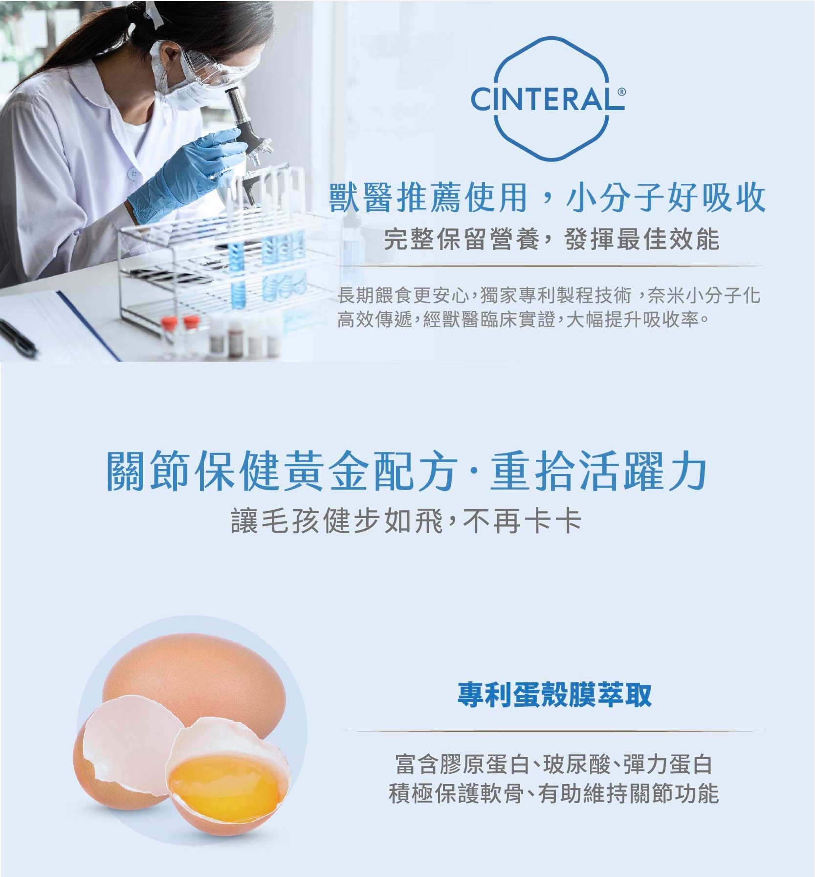 CinterPlex®綜合維生素(含鐵)、Cinteral®專利微生肽、專利鯊魚軟骨素、葡萄糖胺、西班牙專利蛋殼膜水解萃取、綠唇貽貝粉、專利天然玻尿酸萃取、雞肉粉